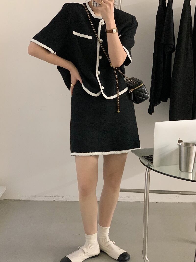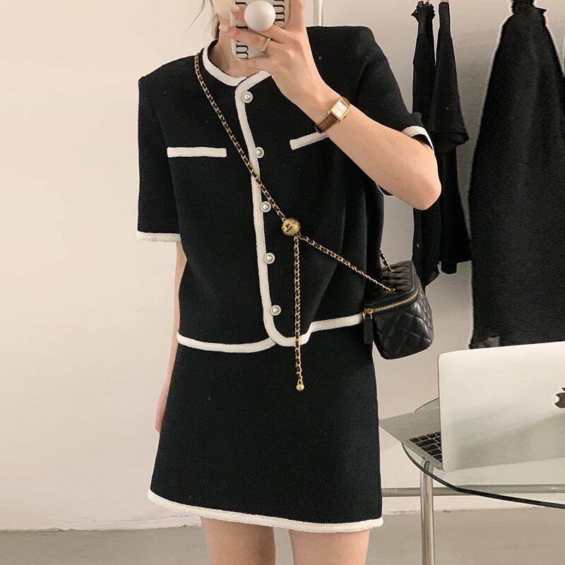 サマーラウンドネックパールボタンカラーショートジャケット ハイウェストウェストスカート レディース 夏物 Oネック 真珠 5/3 春夏 SS Neploe mi46188804825