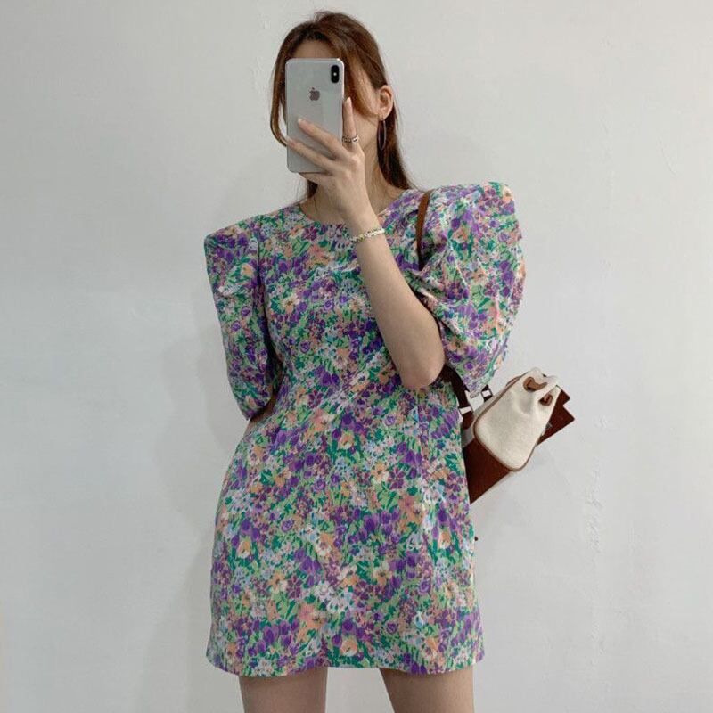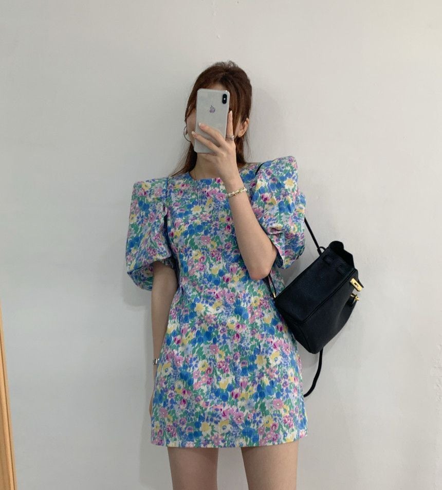 サマースタンダードラウンドネックウェストスリムプリント柄ドレス レトロ 夏物 Oネック 5/3 春夏 SS Neploe mi4626915495069