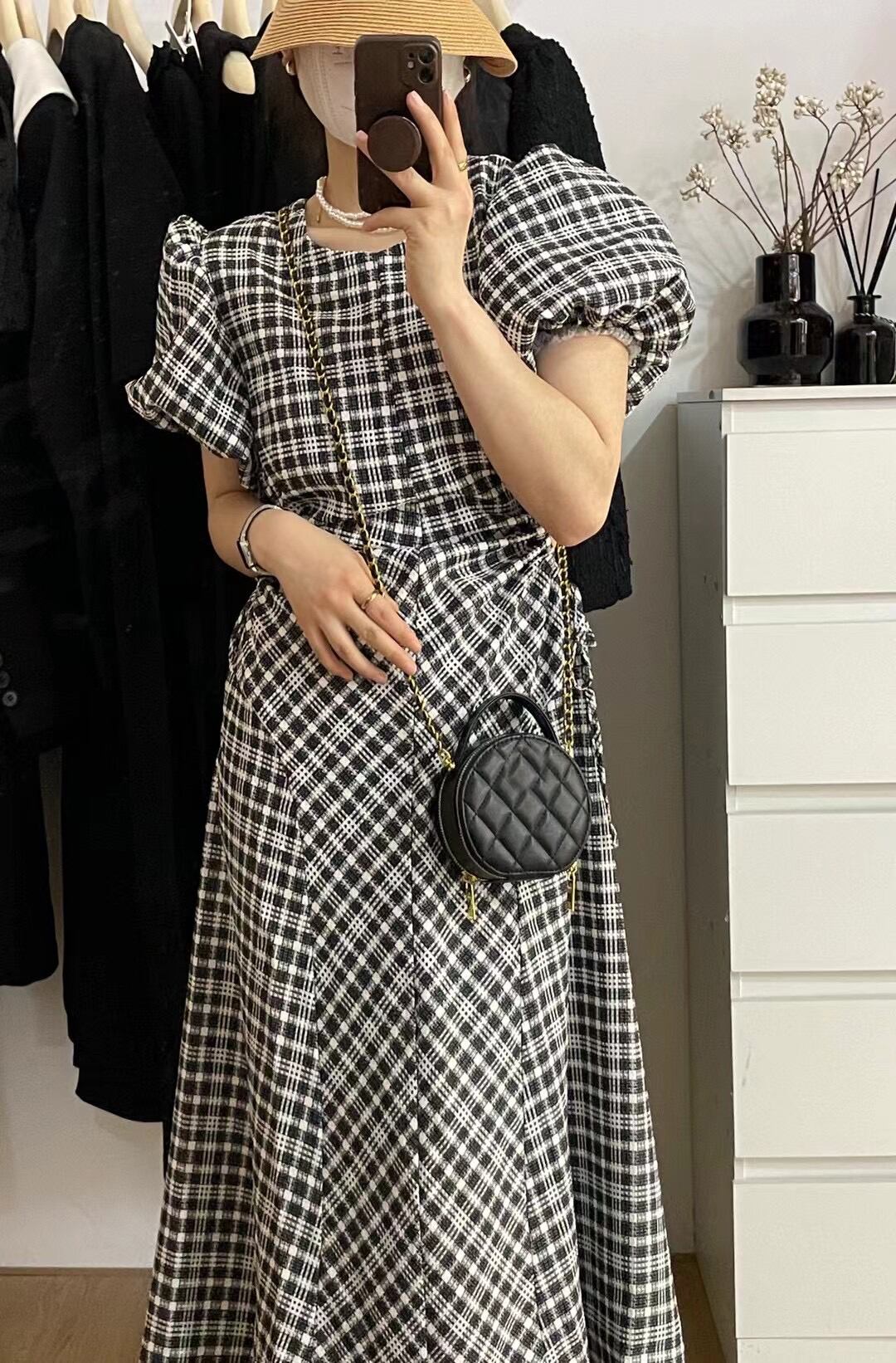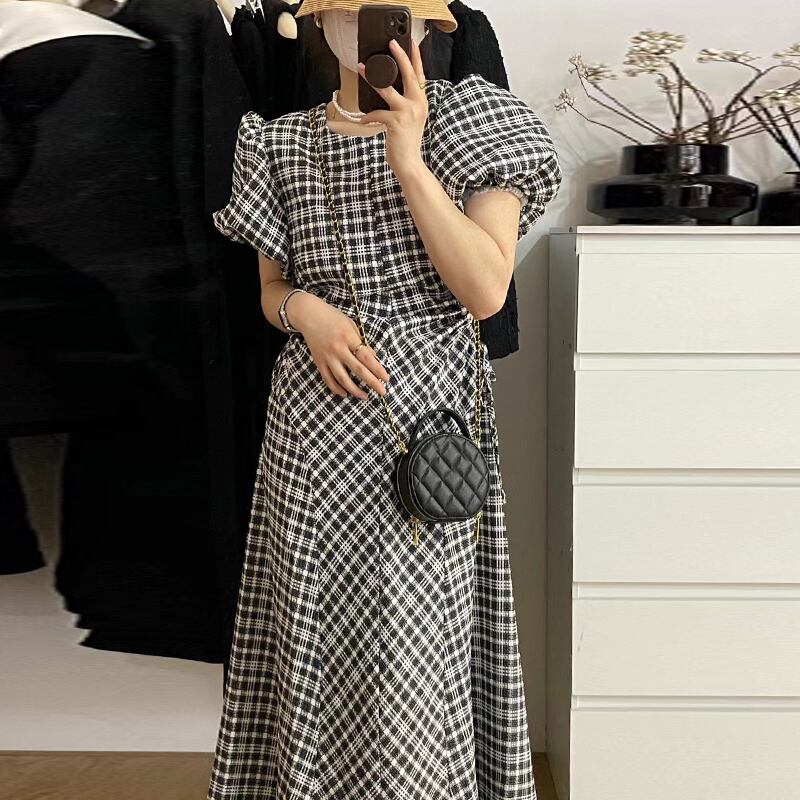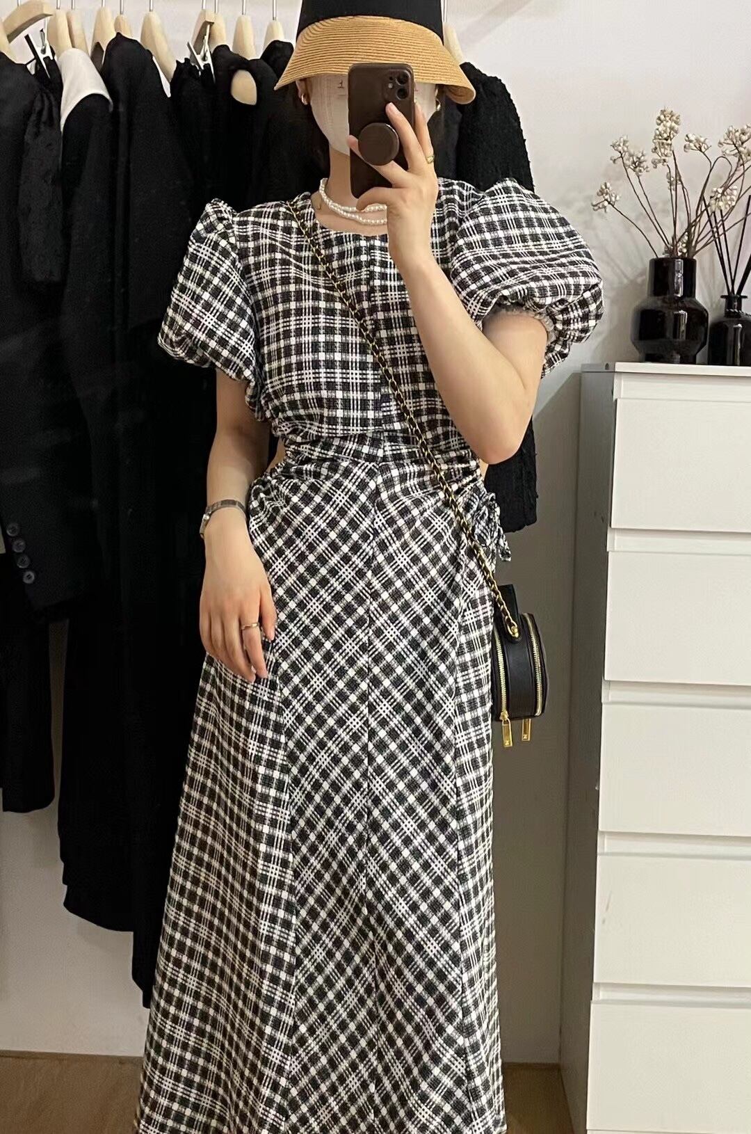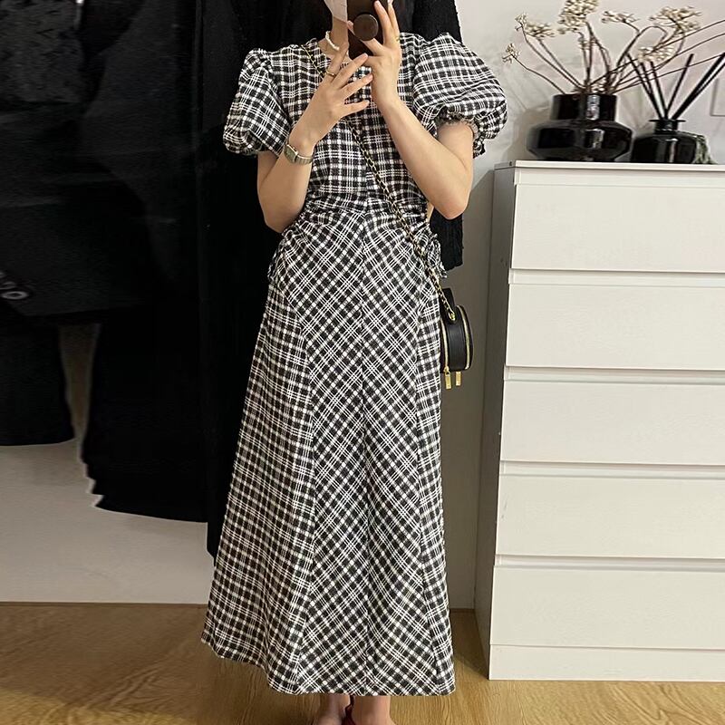 サマースタンダードラウンドネックサイドウェストロング格子柄ドレス レディース レトロ エレガント 夏物 Oネック 5/3 春夏 SS Neploe mi468497016225