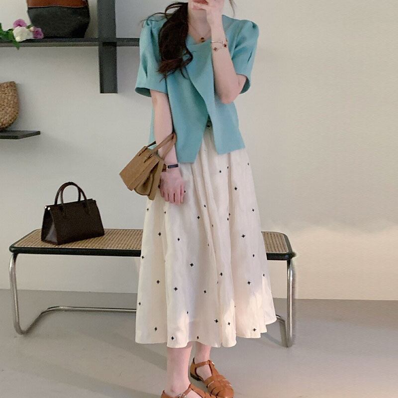 サマーラウンドネックボタンスリーブジャケット ハイウェストウェストフローラルスカート ロング 夏物 花柄 Oネック 5/3 春夏 SS Neploe mi4618021615177