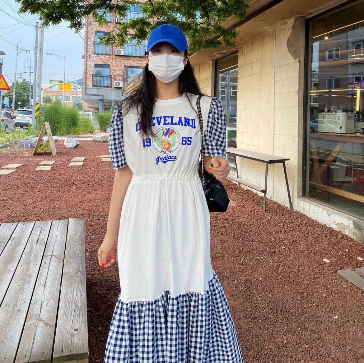 サマーラウンドネックプリント格子柄ドレス ロングスカート レディース 夏物 Oネック ステッチ 5/3 春夏 SS Neploe mi4680546556024