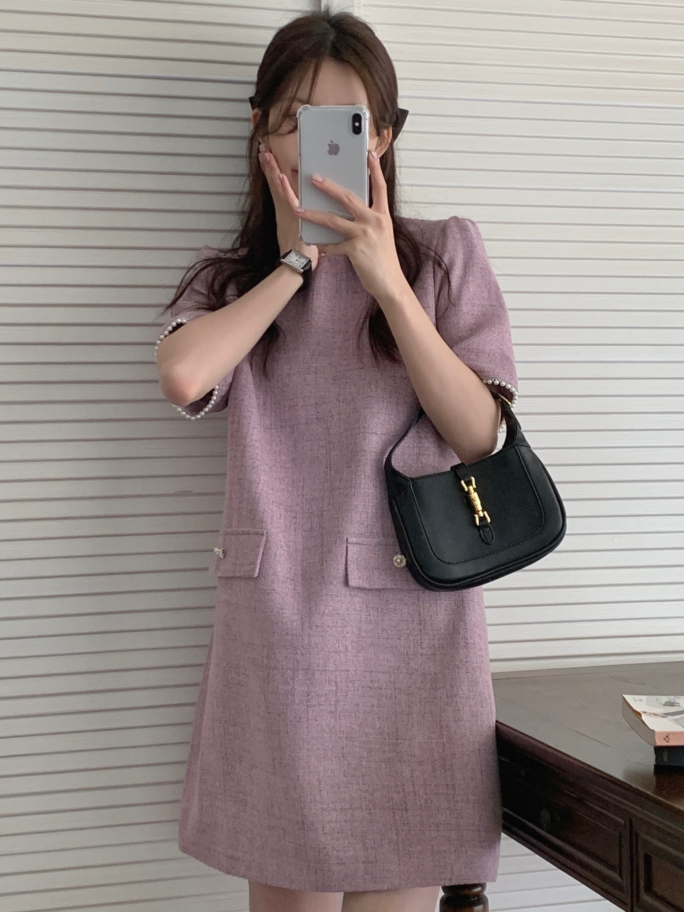 サマーラウンドネックパールルーズポケットドレス ショートスカート エレガント 夏物 Oネック 真珠 5/3 春夏 SS Neploe mi4652478227260