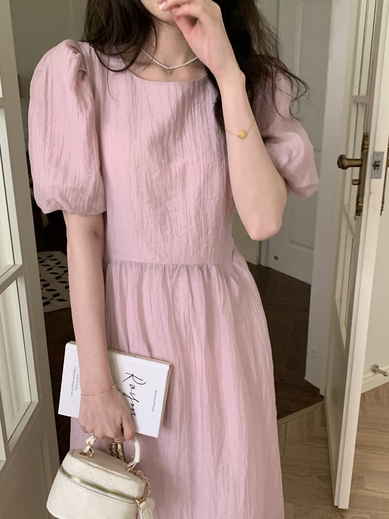 サマーラウンドネックプリーツウェストスリムロングスリーブドレス 大人ガーリー スウィート キュート カジュアル 夏物 Oネック 5/3 春夏 SS Neploe mi4687804189606