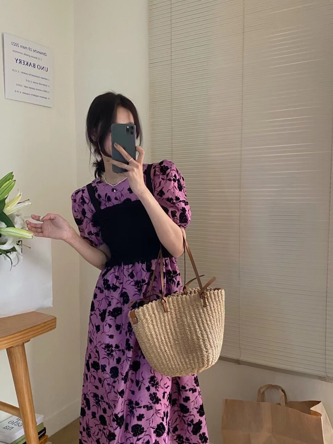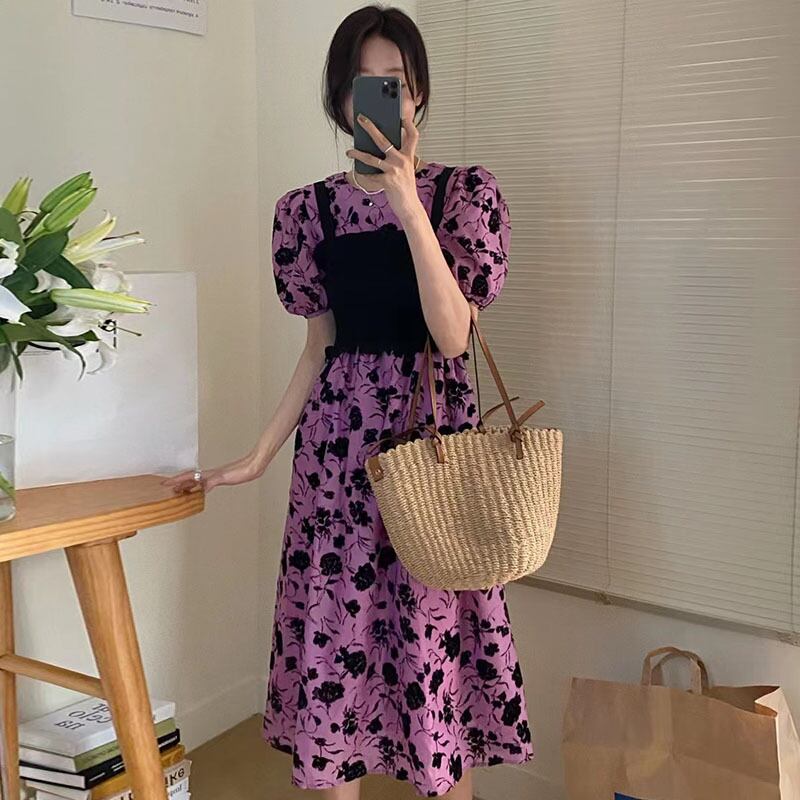 スタンダードラウンドネックスリーブフローラルドレス スリム レトロ エレガント 花柄 Oネック スクウェア 5/3 春夏 SS Neploe mi461754897054
