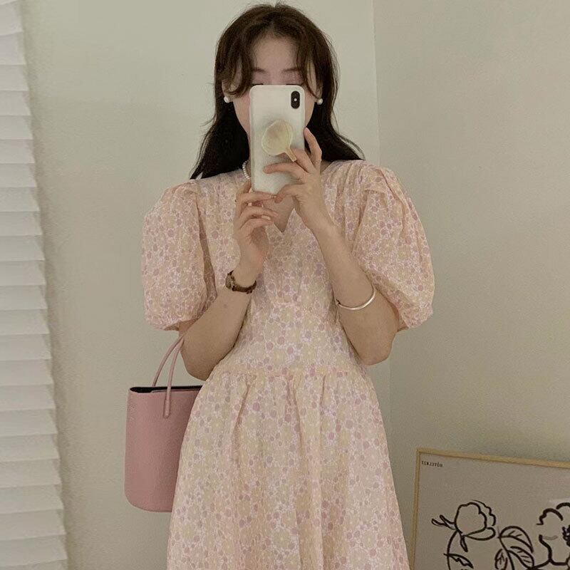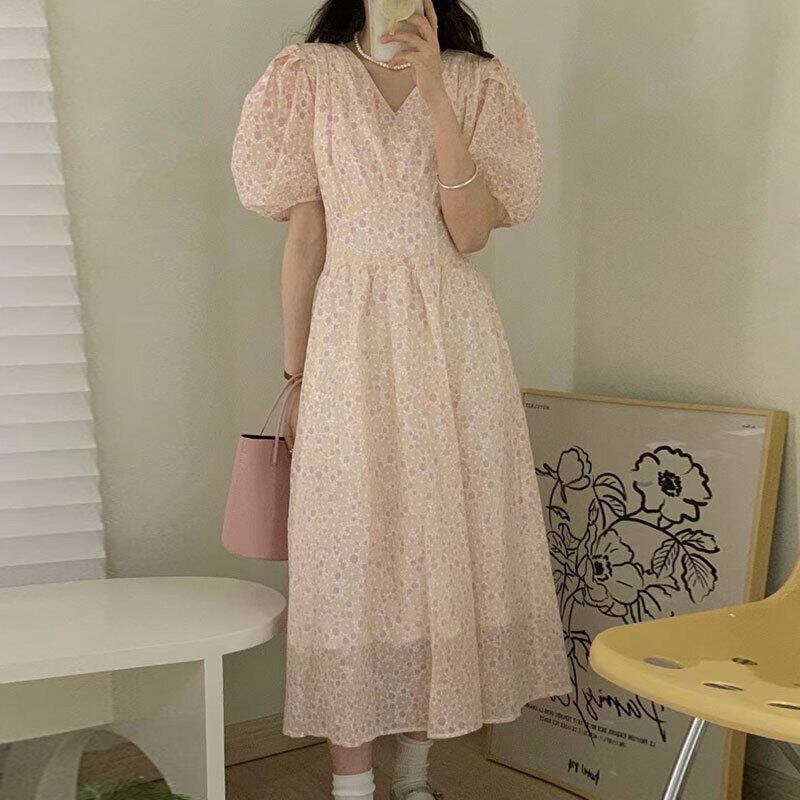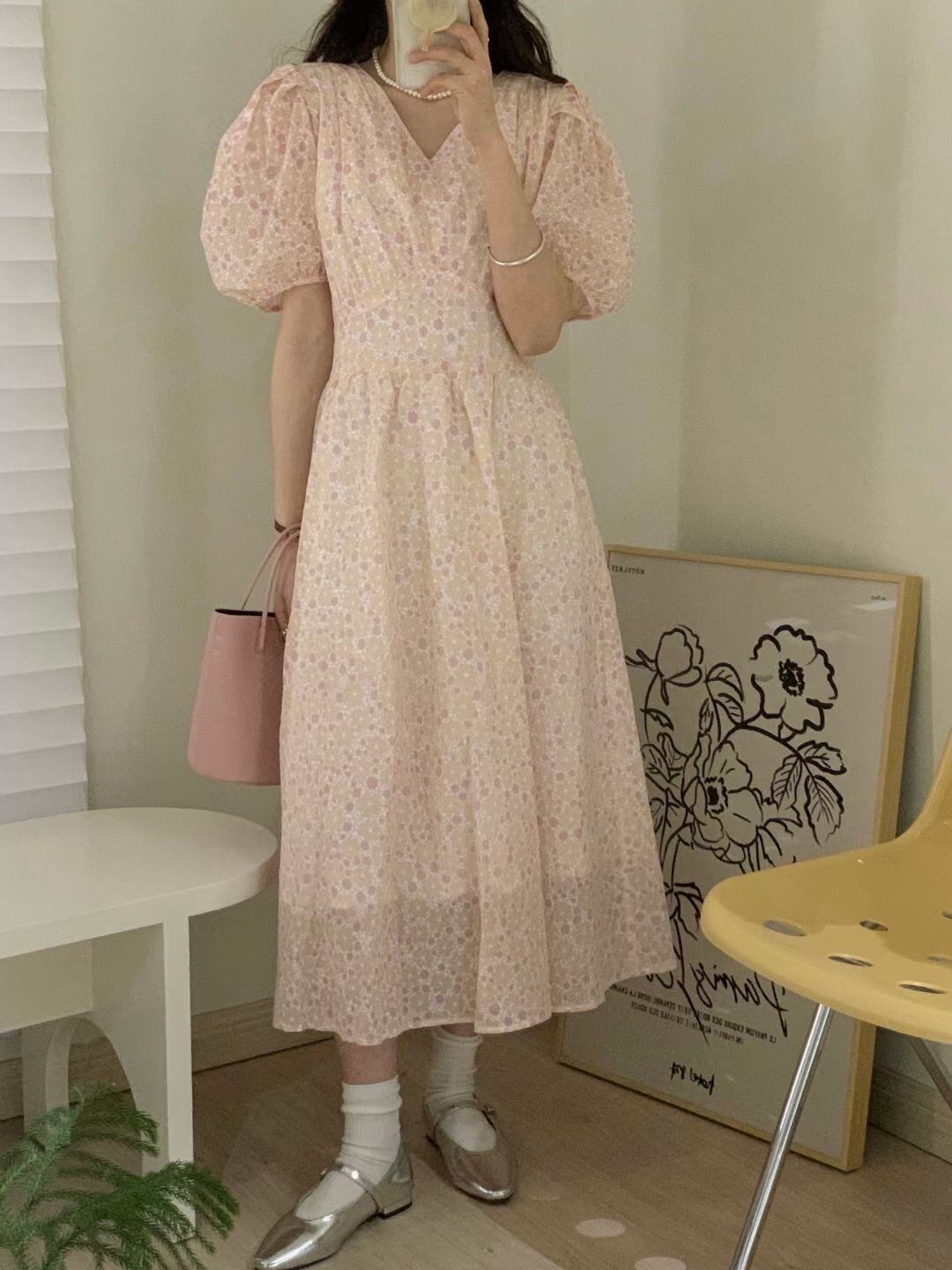サマーVネックウェスト薄手Flowerデザイン スリーブドレス ロングスカート 大人ガーリー スウィート キュート カジュアル 夏物 フラワーデザイン 5/3 春夏 SS Neploe mi4657752952668