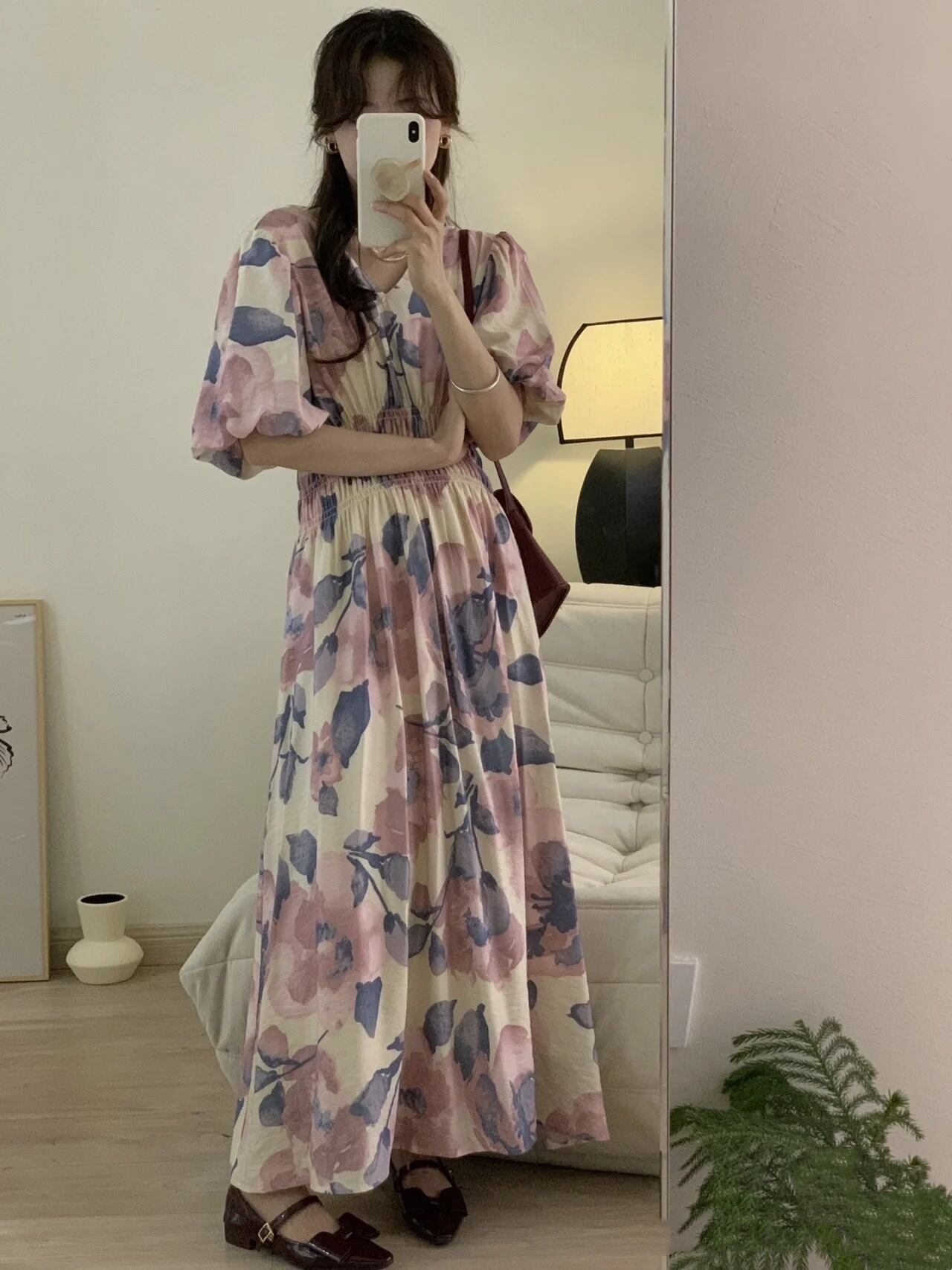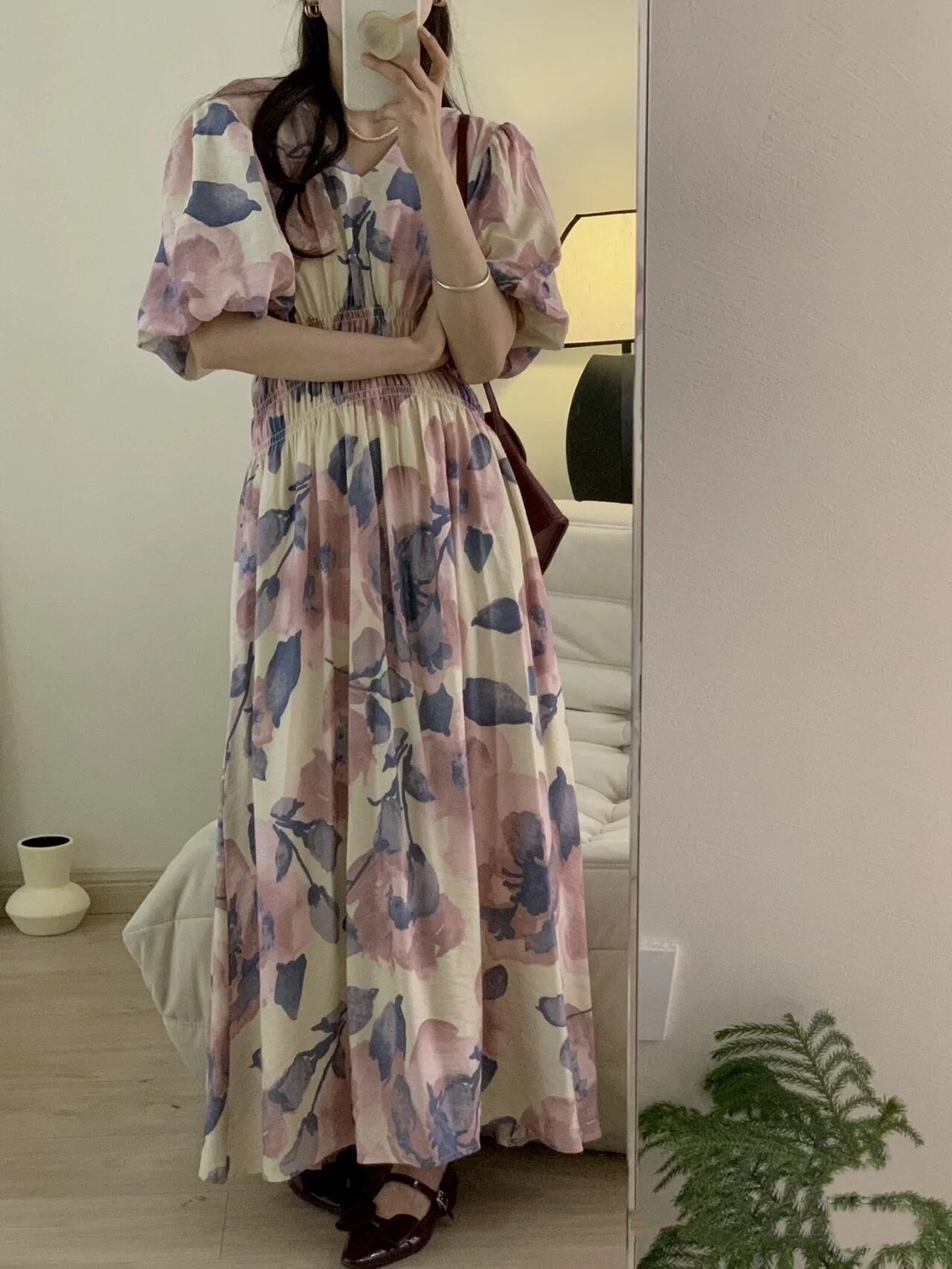 サマーVネックプリーツウェスト薄手フローラルロングドレス レディース エレガント 夏物 花柄 5/3 春夏 SS Neploe mi4615417648809
