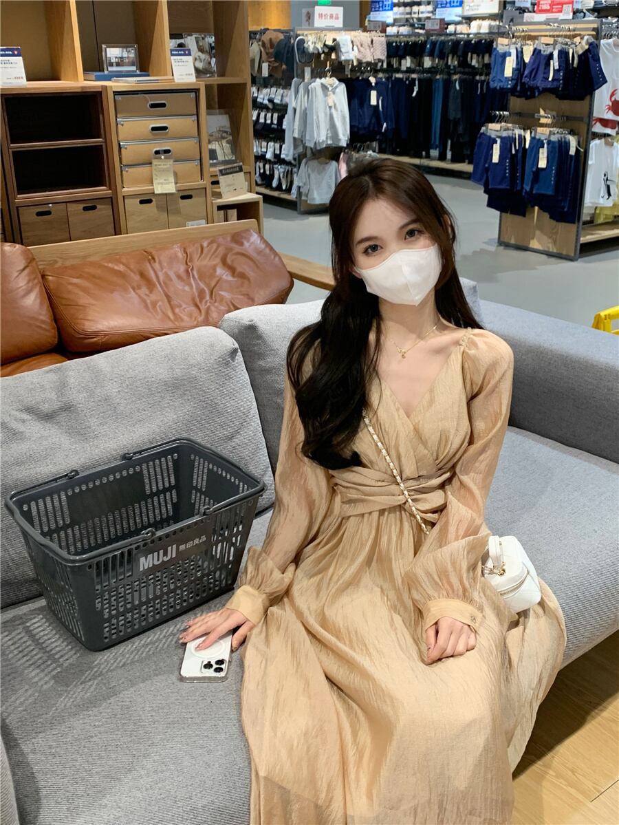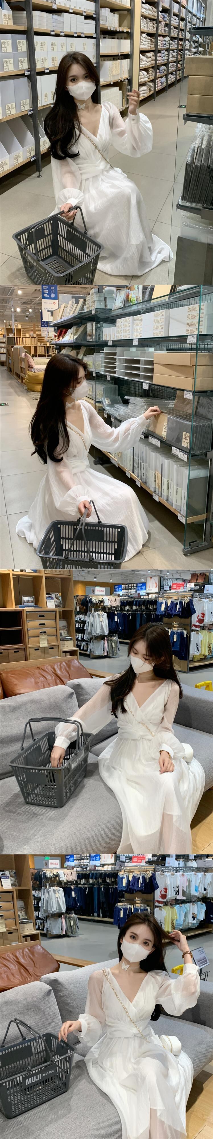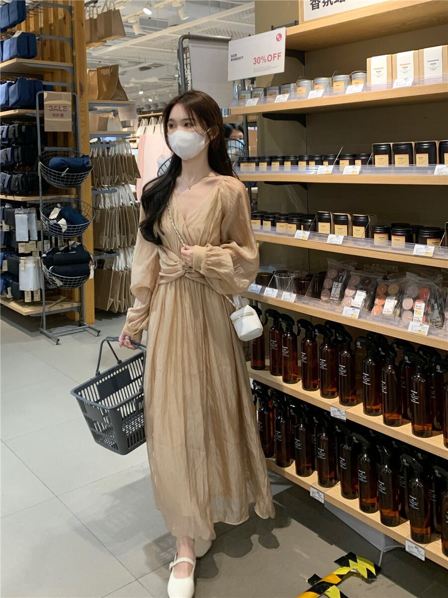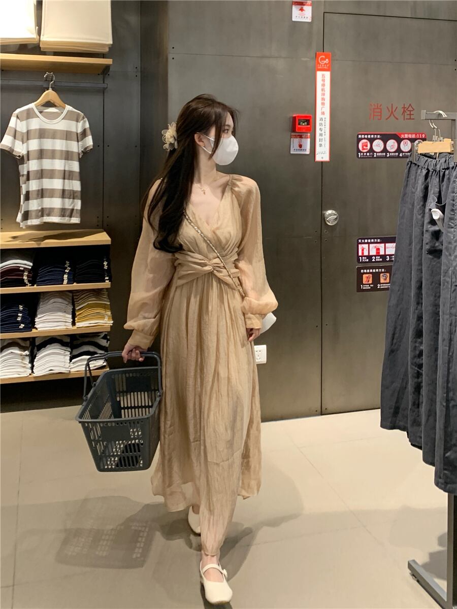 スプリングVネックウェストメッシュスリーブロングドレス レディース 大人ガーリー スウィート キュート カジュアル エレガント 春物 5/3 春夏 SS Neploe mi4634512640286