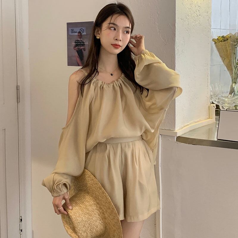 サマーラウンドネックシャツ ハイウェストウェストプリーツルーズポケットショーツ レディース ロング エレガント 夏物 ブルマー Oネック 5/3 春夏 SS Neploe mi4699445899011