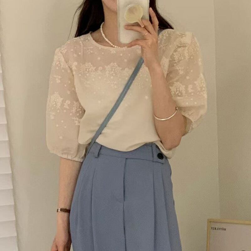 サマーラウンドネックルーズカジュアルレース刺繍スリーブシャツ トップス レディース 夏物 Oネック 5/3 春夏 SS Neploe mi4611201526347