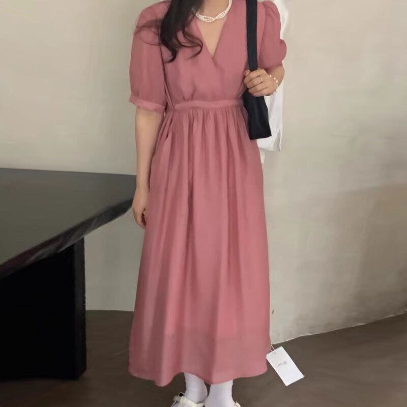 サマークロスVネックポケットウェストスリムスリーブロングドレス レディース エレガント 夏物 5/3 春夏 SS Neploe mi4644796339605