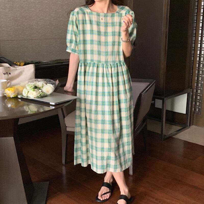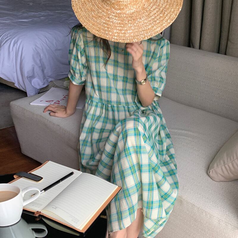 サマーグリーンラウンドネックカラー格子柄ルーズカジュアルスリーブドレス 夏物 Oネック 5/3 春夏 SS Neploe mi4673117734567