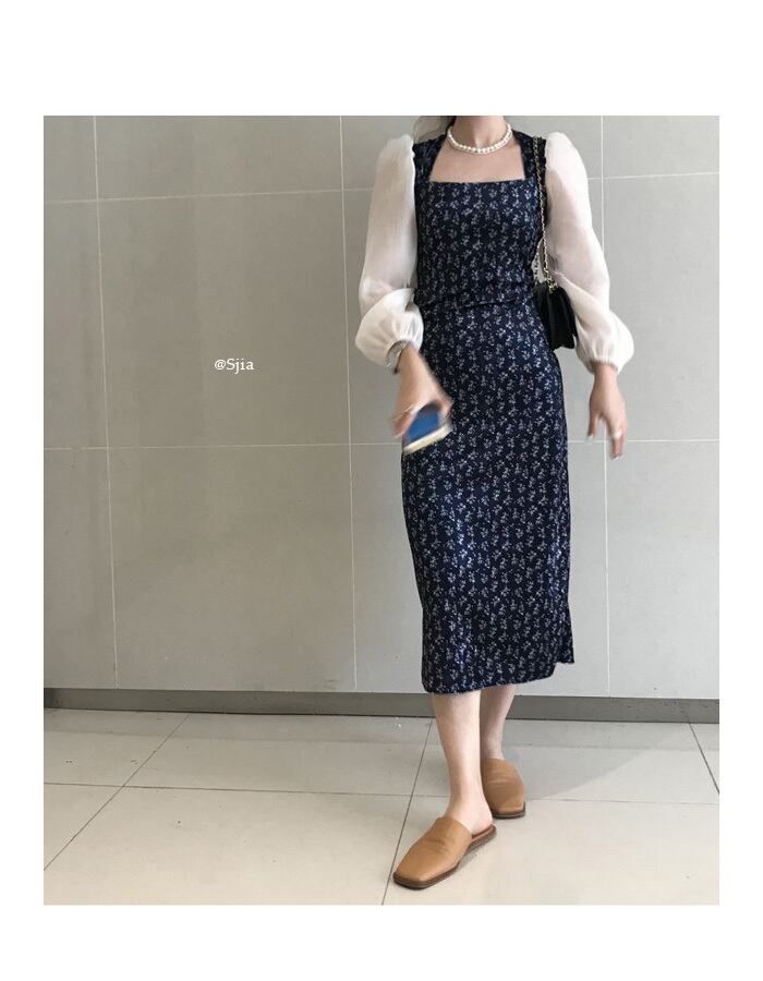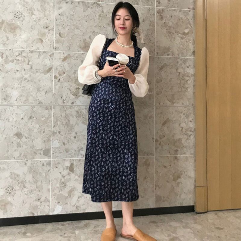 スタンダードウェストメッシュスリーブフローラルドレス ロングスカート レトロ 花柄 スクウェア 5/3 春夏 SS Neploe mi463813292321