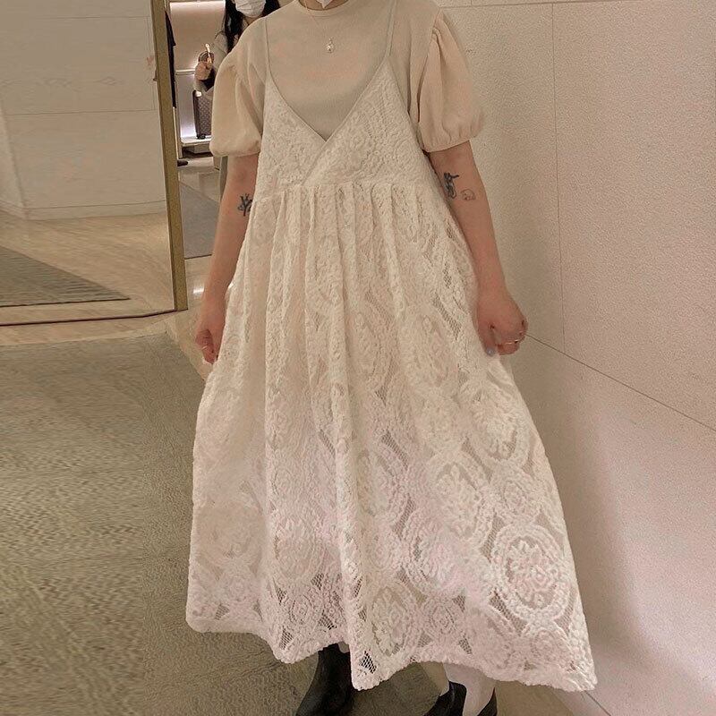サマーラウンドネックルーズスリーブシャツ レースFlowerデザイン ドレス 夏物 Oネック フラワーデザイン 5/3 春夏 SS Neploe mi4639669801904