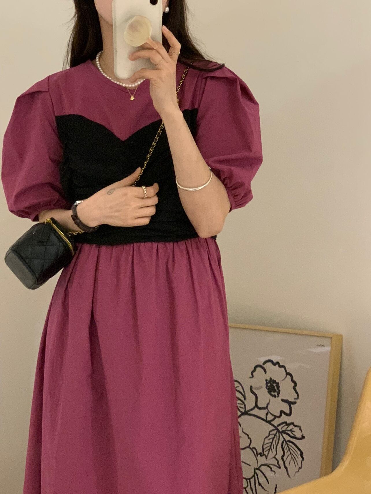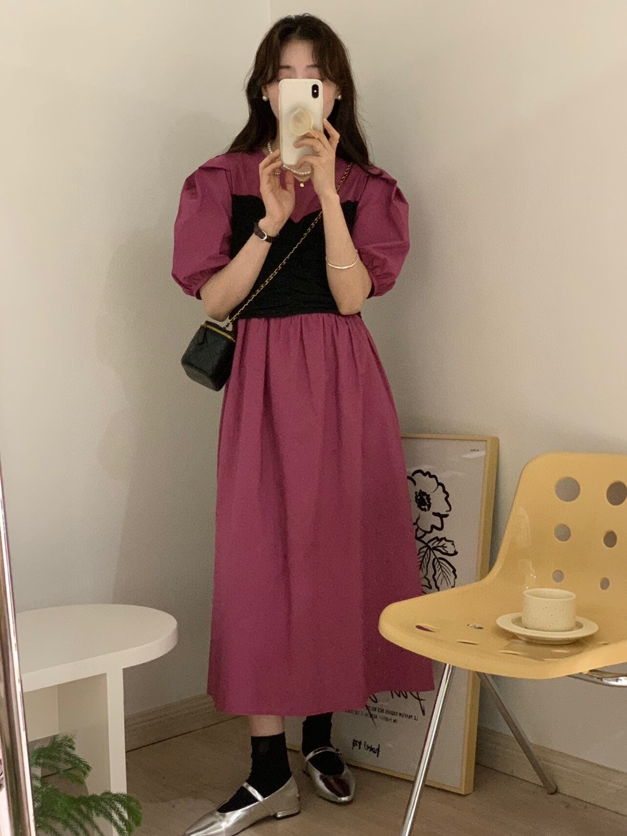 スタンダードラウンドネックカラーレースウェストスリーブドレス ロングスカート レディース レトロ Oネック ステッチ 5/3 春夏 SS Neploe mi4637122530734