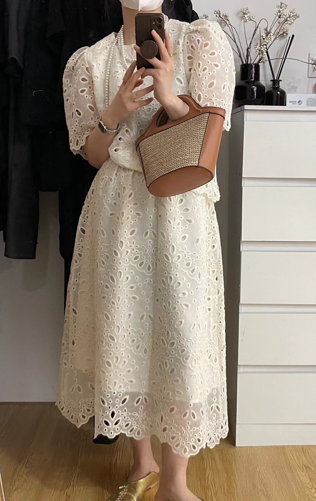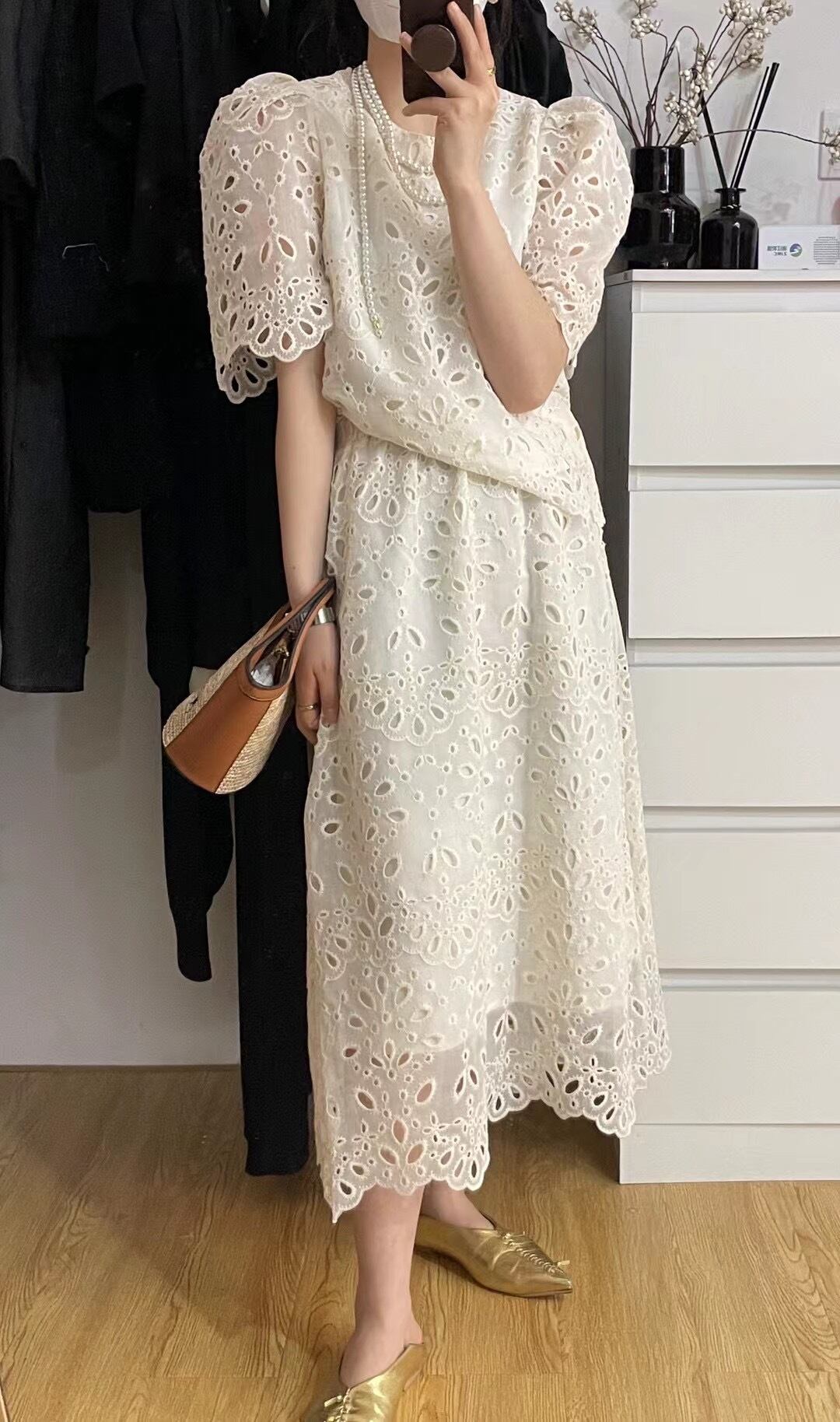 サマーラウンドネックレースジャカードスリーブシャツ ハイウェストウェストスリムスカート レディース 夏物 Oネック 5/3 春夏 SS Neploe mi461658152978