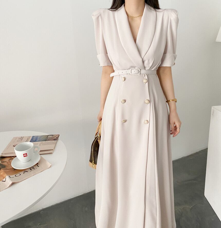 サマーダブルブレストウェストスリムロングドレス ベルト 夏物 ハーネス 5/3 春夏 SS Neploe mi4658766255447