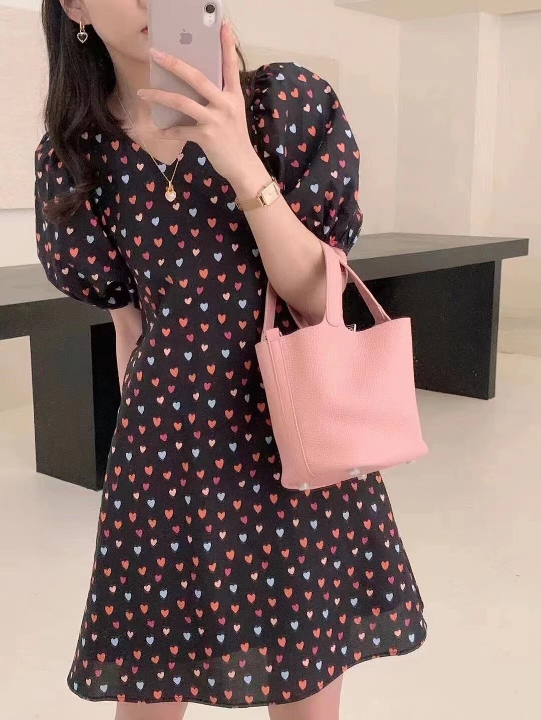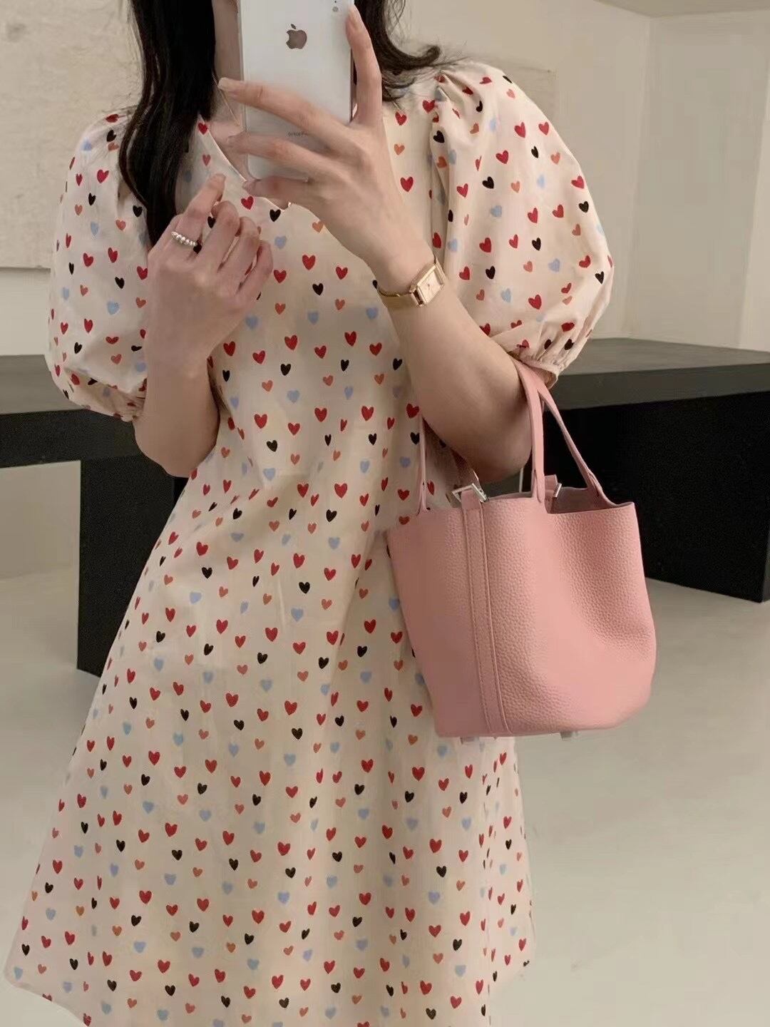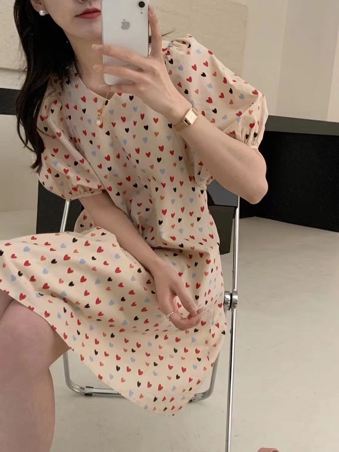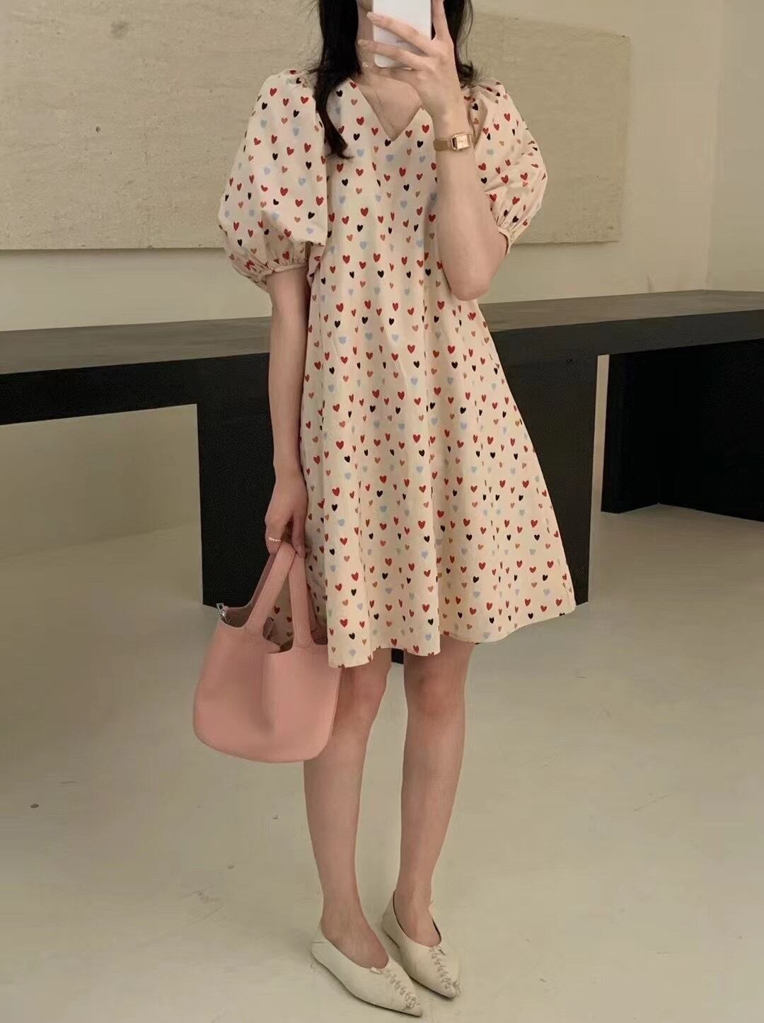 サマーVネックカラープリント柄ウェストスリムスリーブドレス ショートスカート 大人ガーリー スウィート キュート カジュアル 夏物 5/3 春夏 SS Neploe mi465396896145