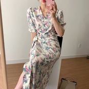 スプリングVネッククロスサイドウェストスリーブフローラルドレス ロングスカート エレガント 春物 花柄 5/3 春夏 SS Neploe mi468287497567