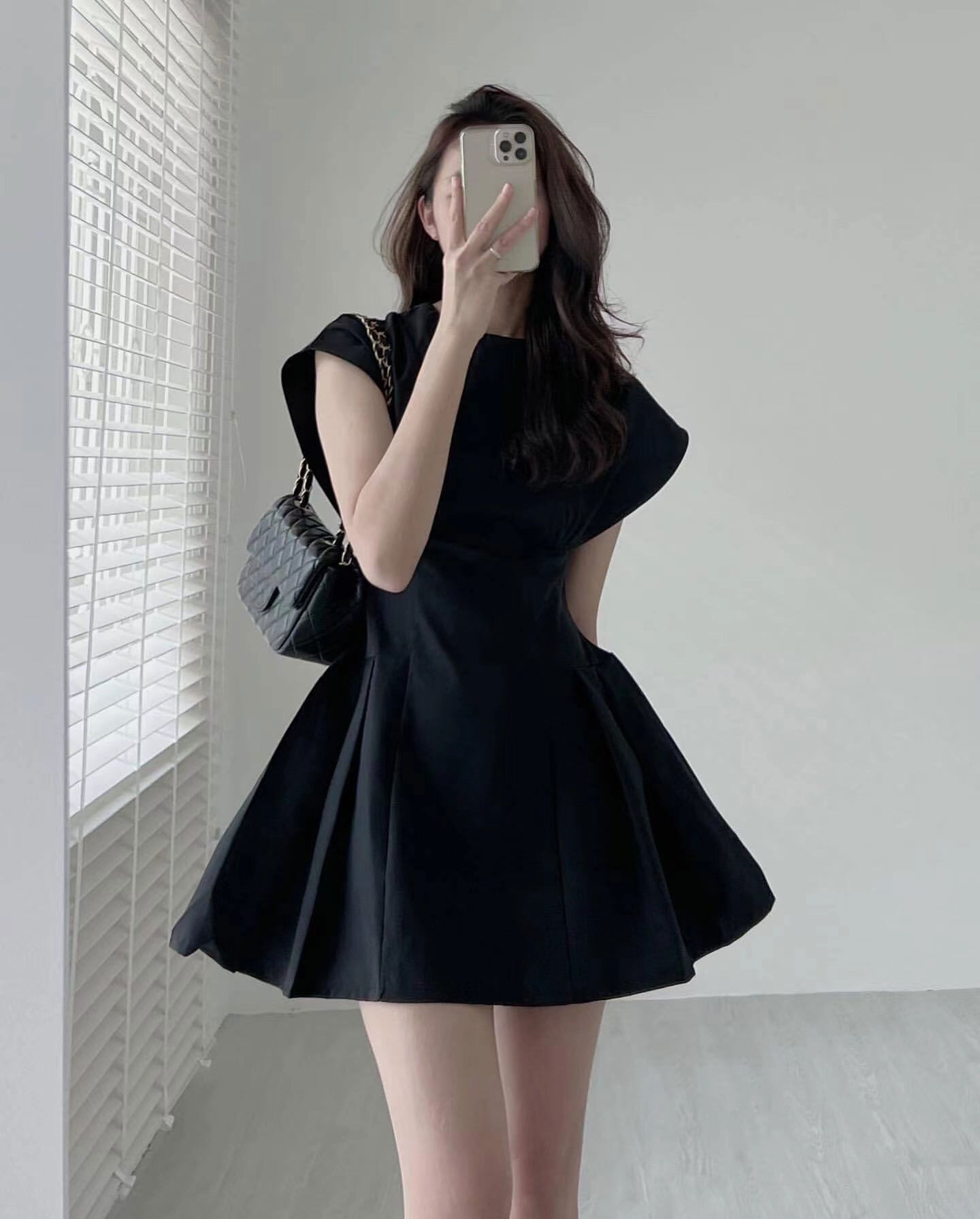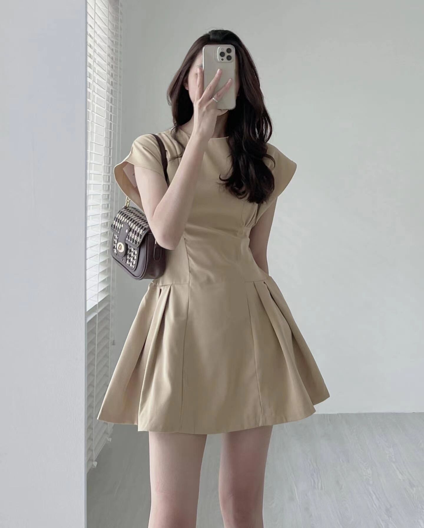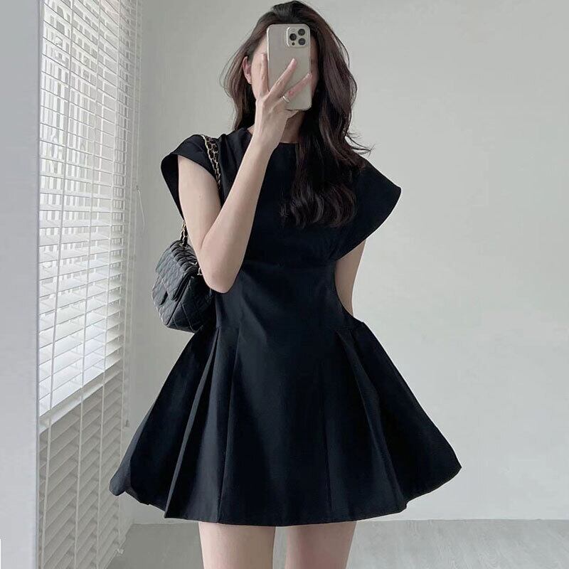 サマーラウンドネックソリッド カラーウェストスリムスリーブドレス ショートスカート レディース エレガント 夏物 Oネック ソリッドカラー 5/3 春夏 SS Neploe mi4684588187597