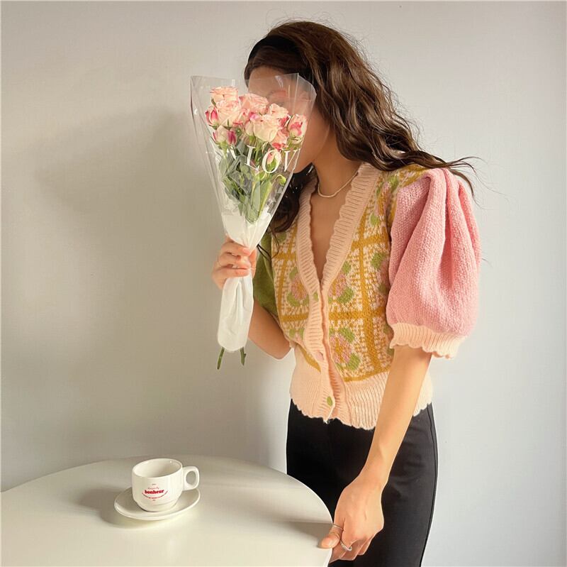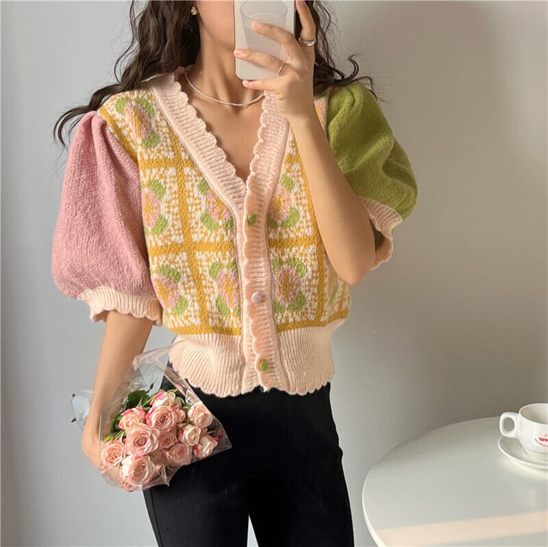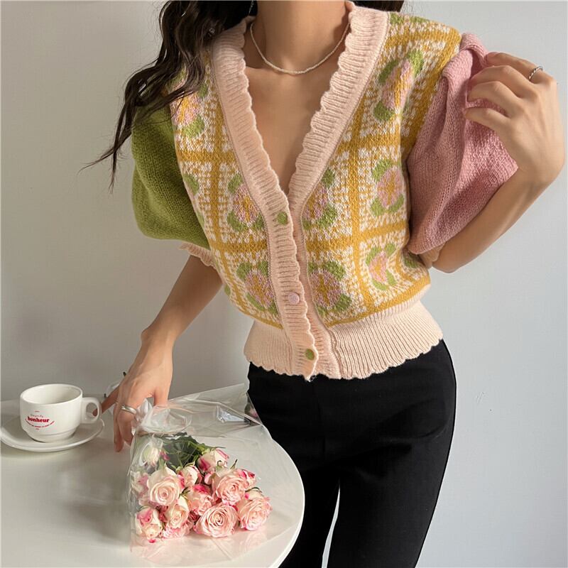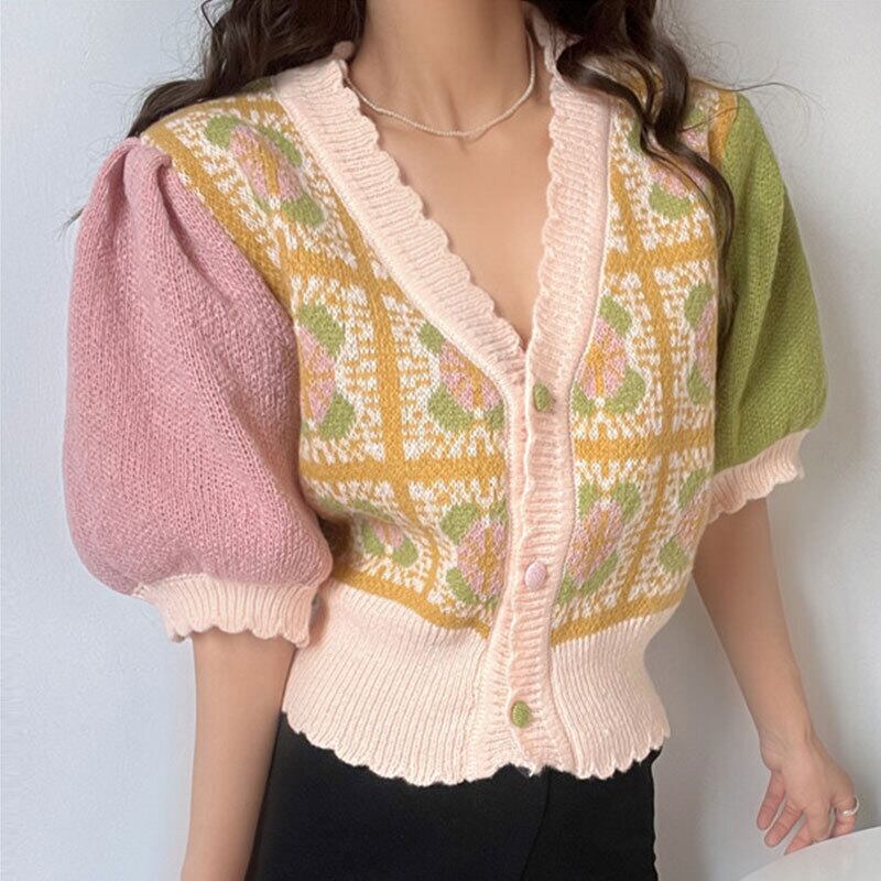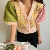 サマーVネックパターンジャカードスリーブニットカーディガントップス レディース 夏物 5/3 春夏 SS Neploe mi4654153673792