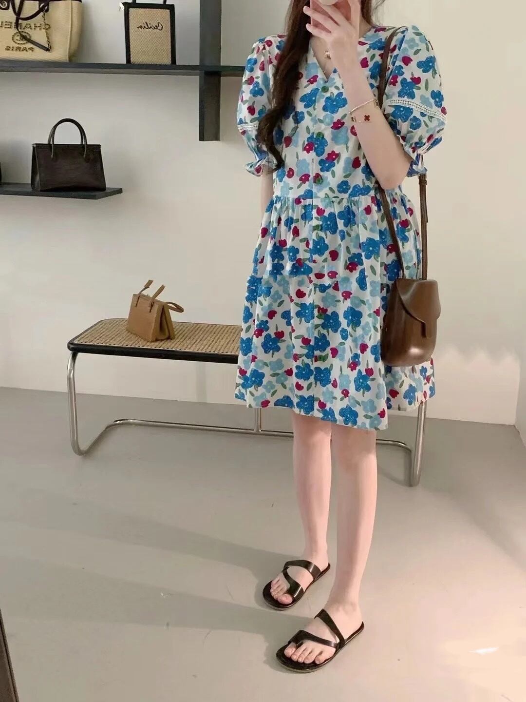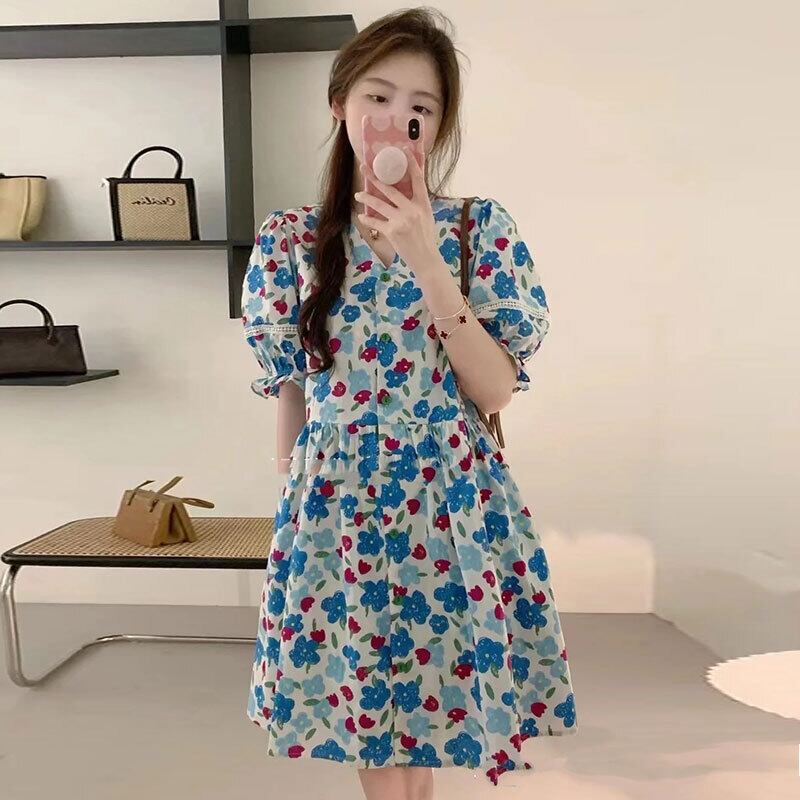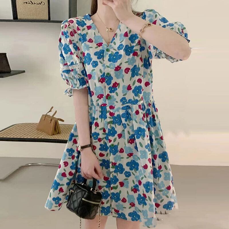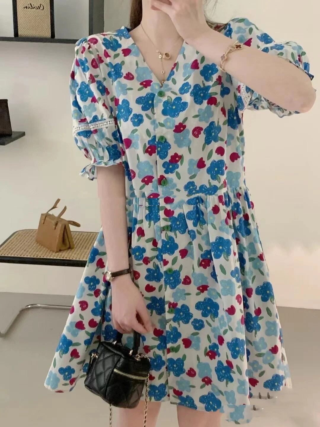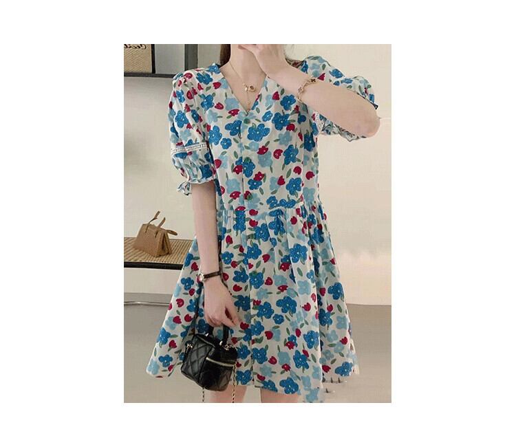 サマーVネックプリーツウェストパターンプリントショートAラインドレス スカート レディース 夏物 5/3 春夏 SS Neploe mi4651930281770