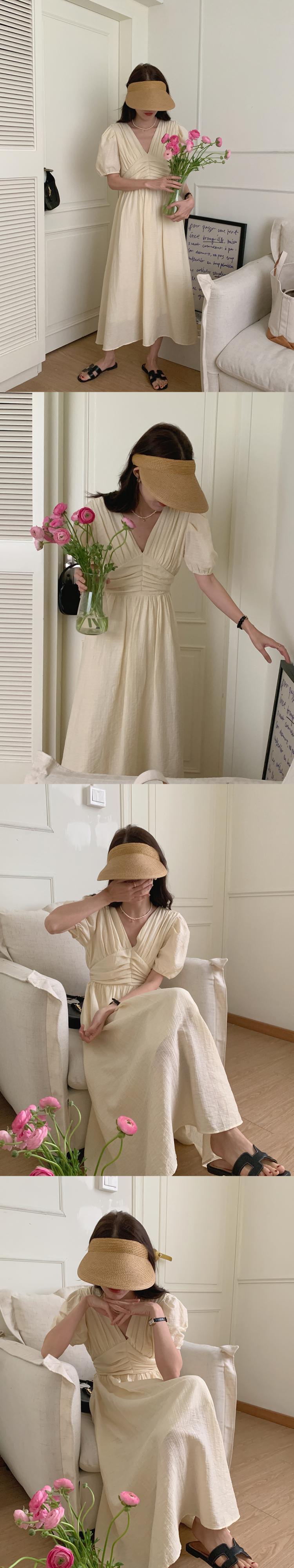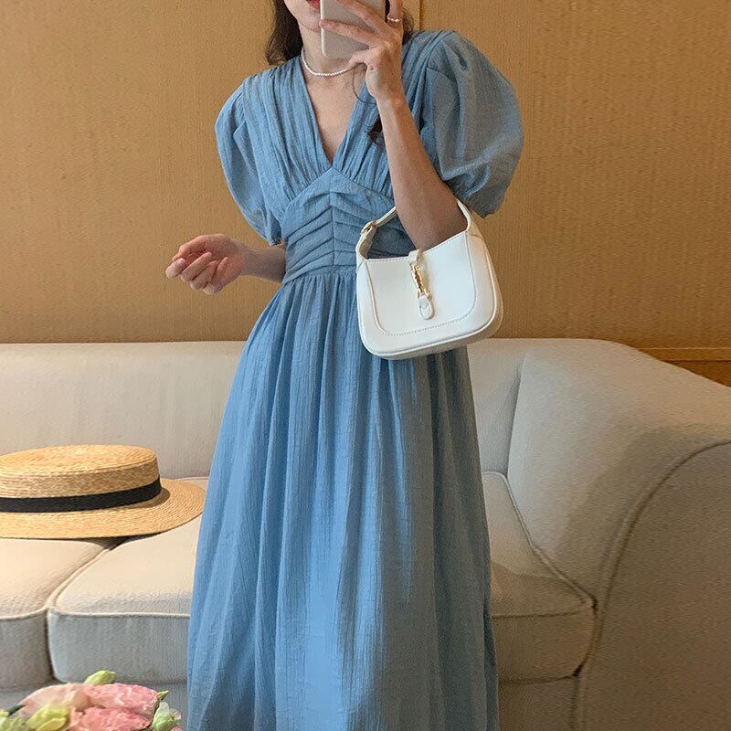 サマーVネックソリッド カラープリーツウェストスリムスリーブドレス ロングスカート レディース 夏物 ソリッドカラー 5/3 春夏 SS Neploe mi4621370559707