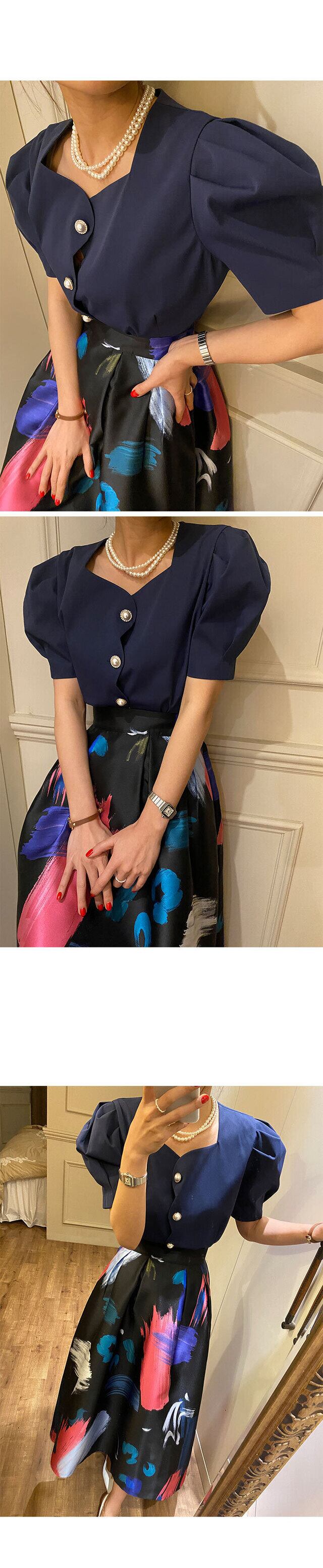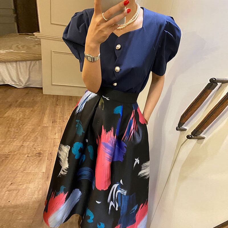 スタンダードカラールーズスリーブシャツ ハイウェストウェストプリント柄スカート レディース レトロ スクウェア 5/3 春夏 SS Neploe mi4634711365840