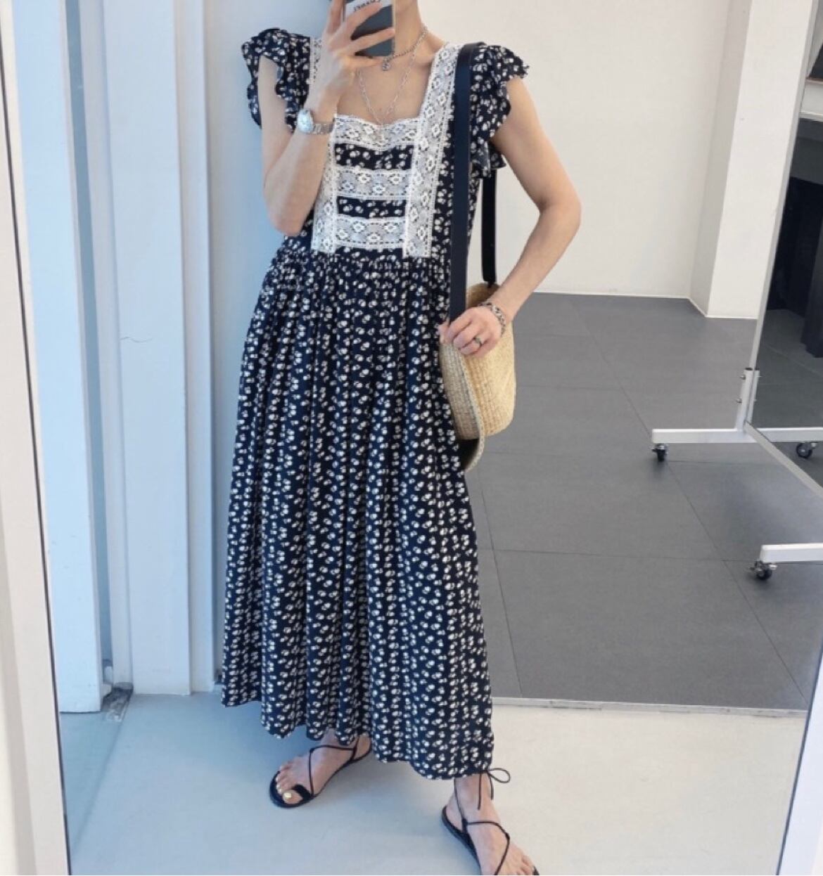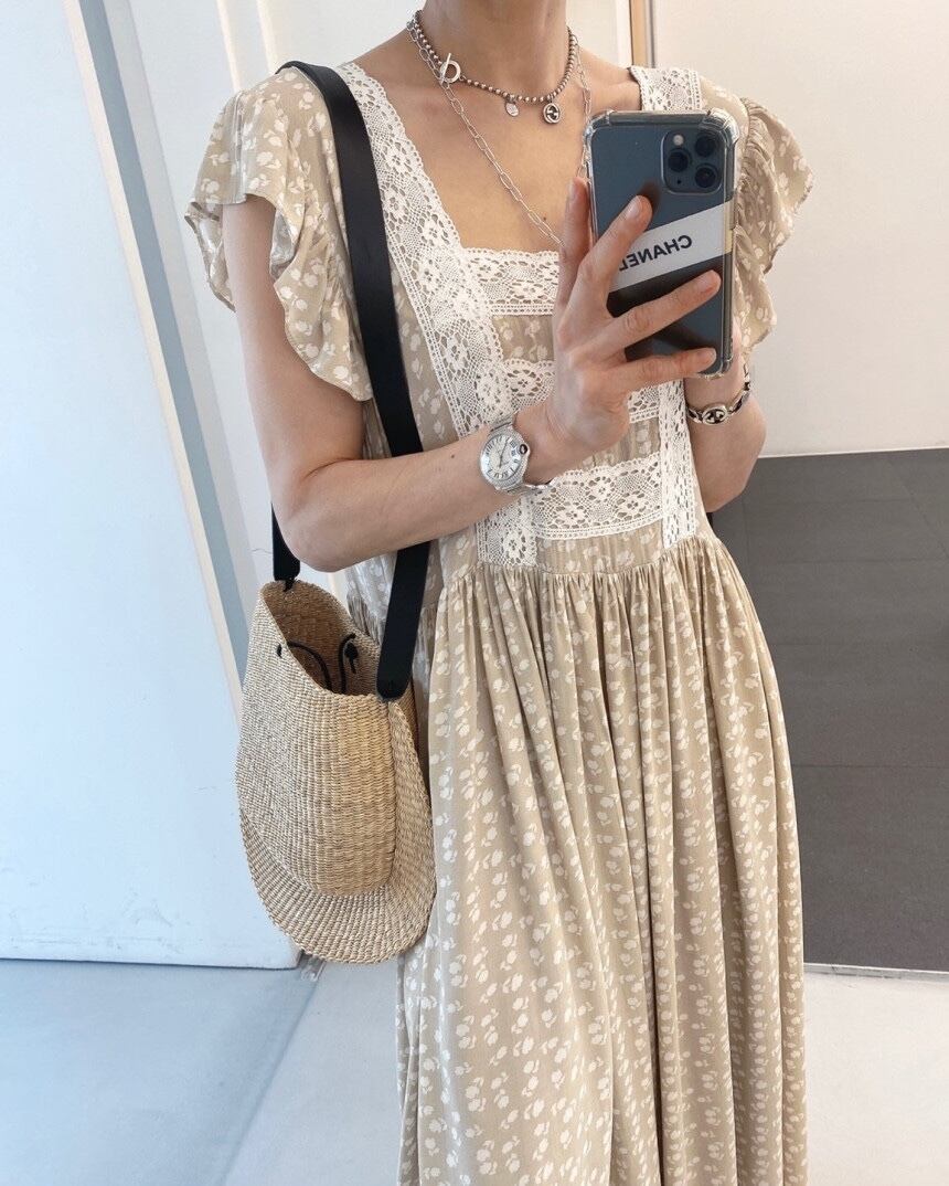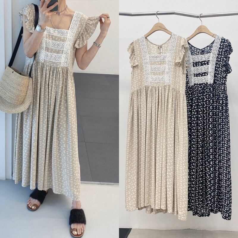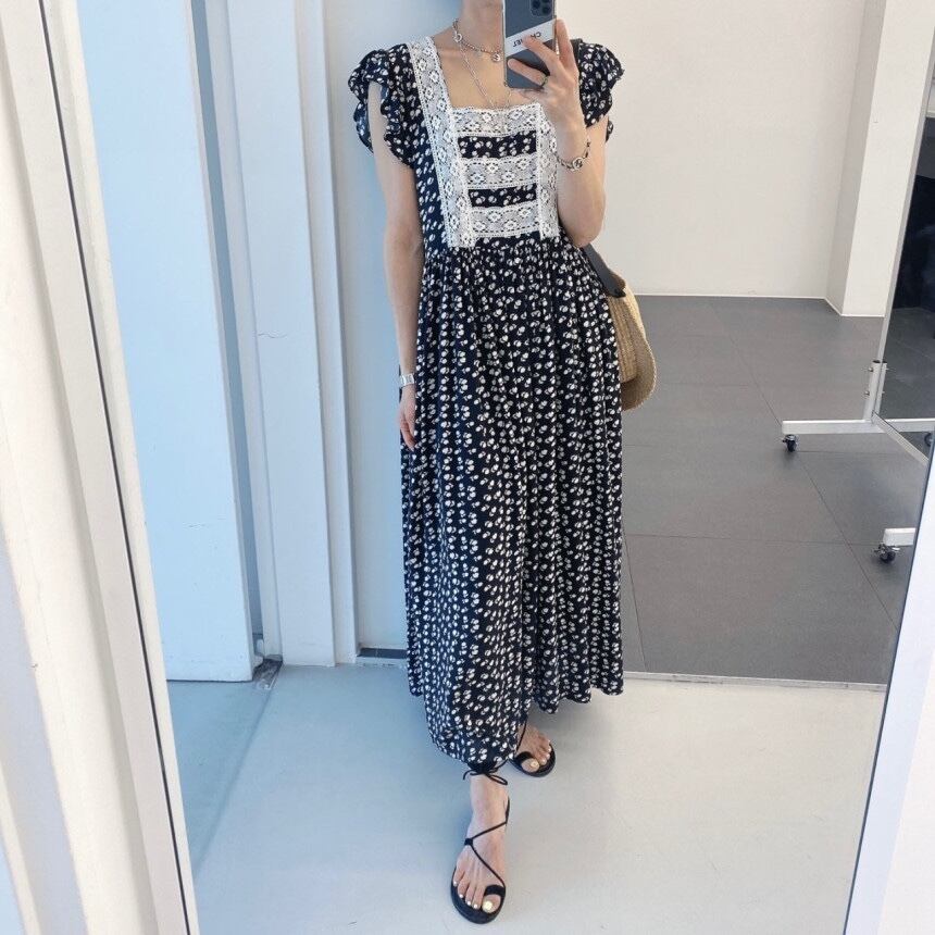 カラーレースノースリーブロングフローラルドレス サマー 夏物 花柄 スクウェア ステッチ 5/17 mi4671318194909