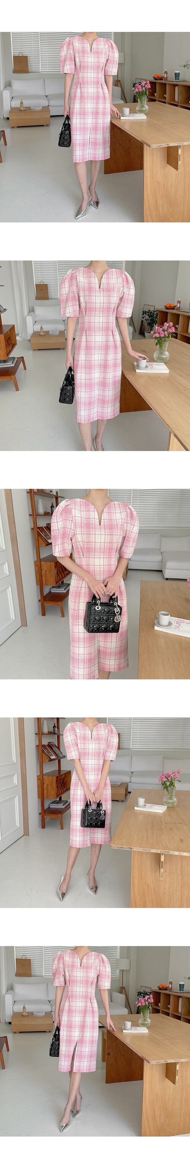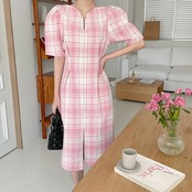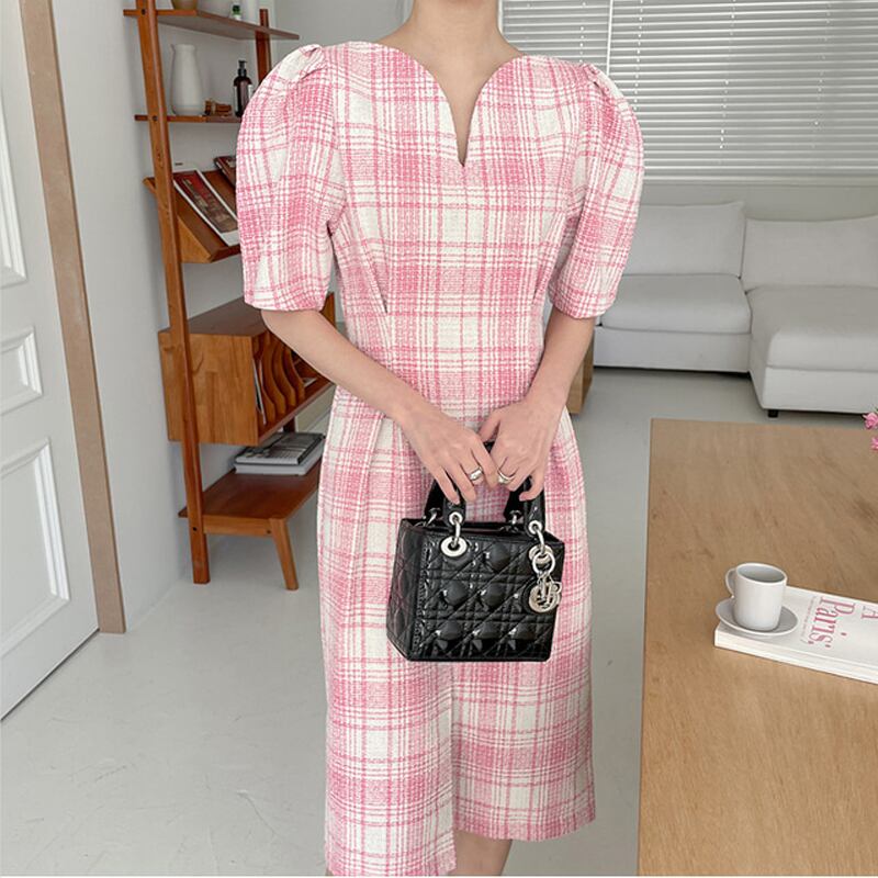 サマーVネックプリーツウェストロング格子柄ドレス レディース エレガント 夏物 5/17 mi4684742085313