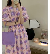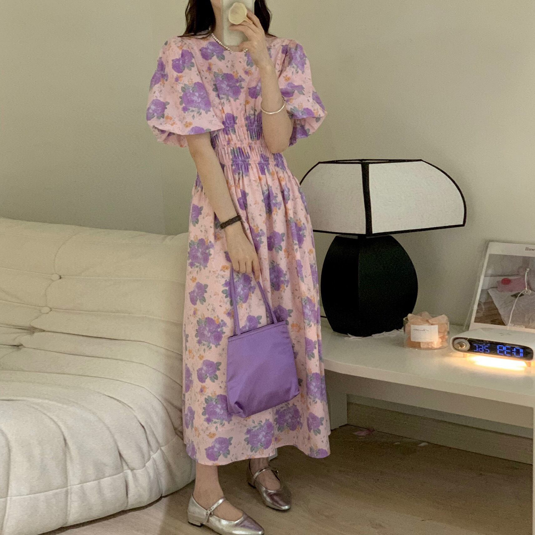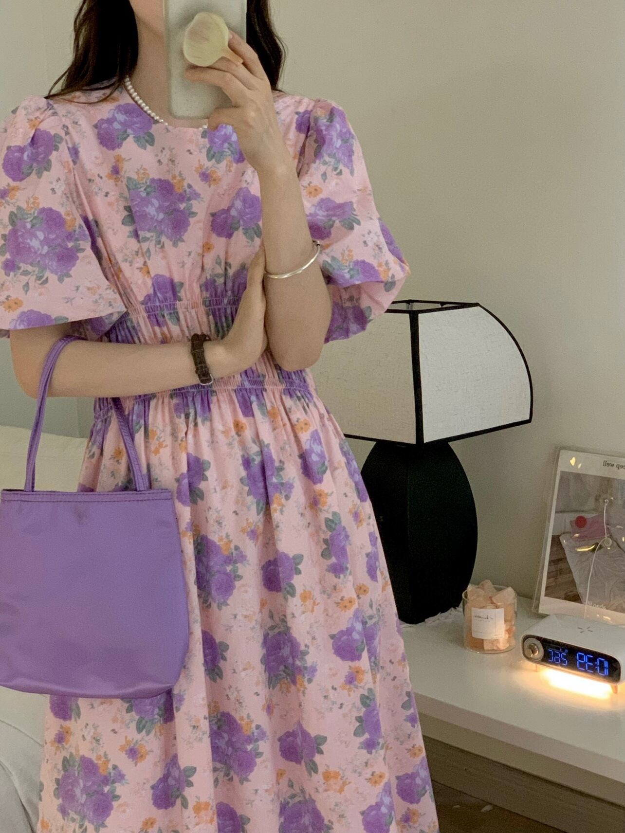 スタイルスリーブスカート プリーツストレッチウェストフローラルドレス エラスティック 伸縮 花柄 5/17 mi4650452892851