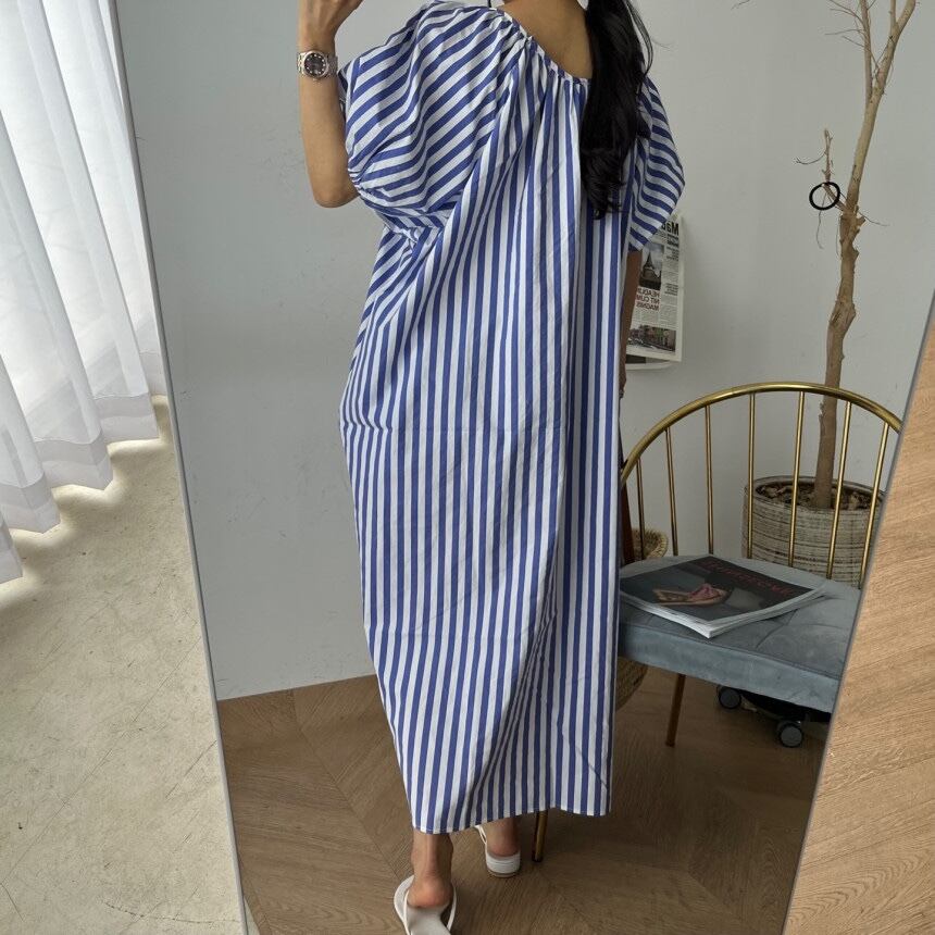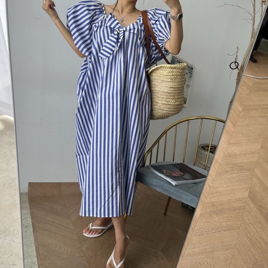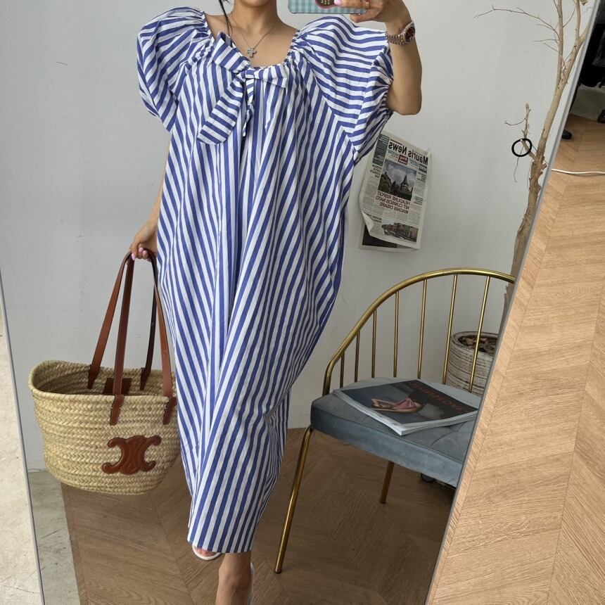 スタイルリボンルーズカジュアルスリーブストライプドレス ロングスカート ランタンスリーブ スクウェア 5/17 mi462783521108