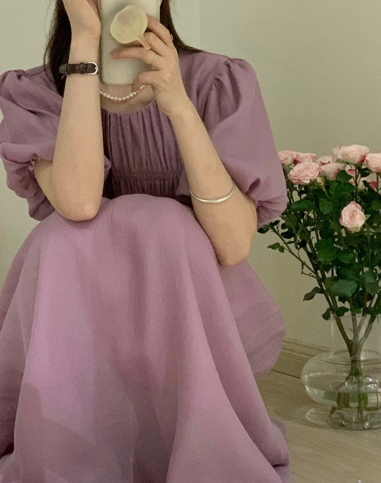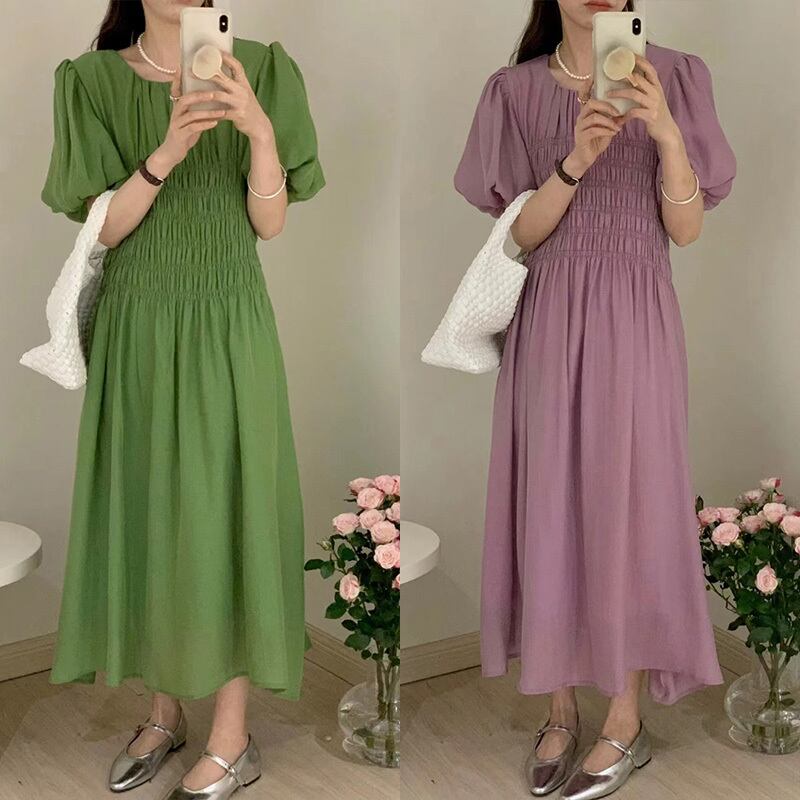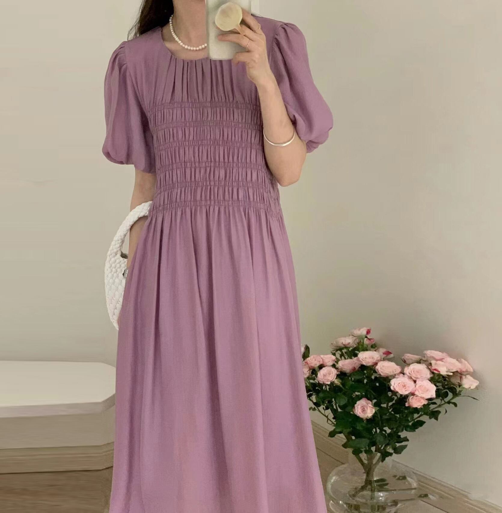スタイル薄手ストレッチプリーツウェストドレス スリーブスカート エラスティック 伸縮 パープル 5/17 mi4636322802899