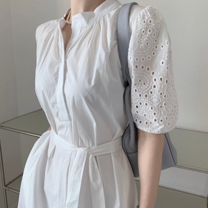 スタイルサマースタンドカラーカラーレースFlowerデザイン ウェストスリーブAラインドレス 夏物 フラワーデザイン ステッチ 5/17 mi4669369181549