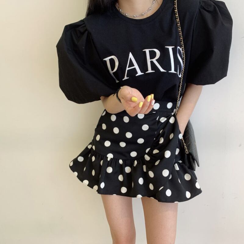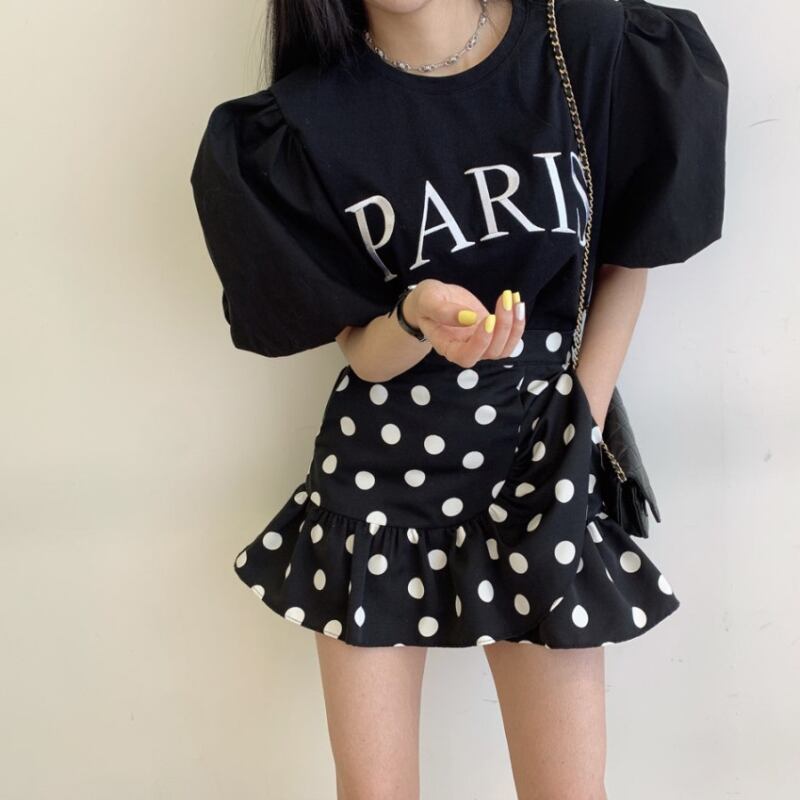 プリント柄スタイルスリーブトップス ラッフルブラック水玉ウェストAラインショートスカート 5/17 mi4657359277177