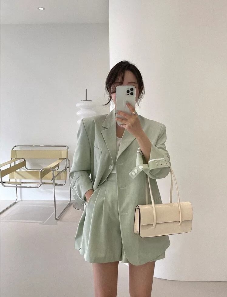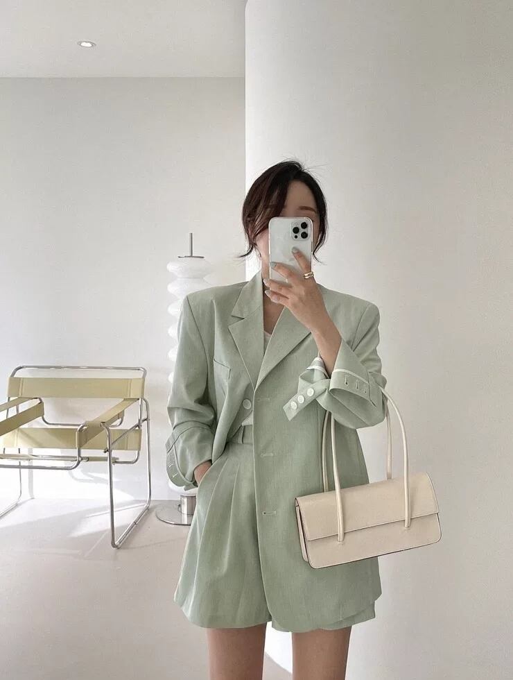 色:ライトグリーンのショートパンツ,ベージュのショートパンツ,黒のショートパンツ,薄緑のスーツ,ベージュスーツ,黒いスーツ