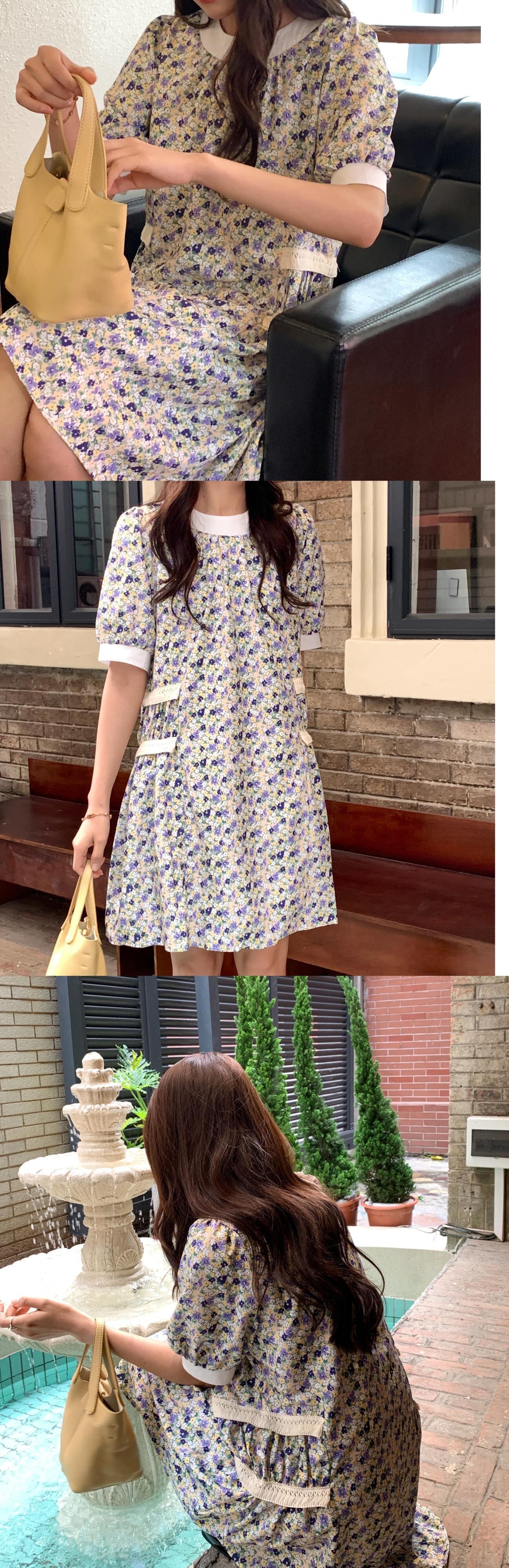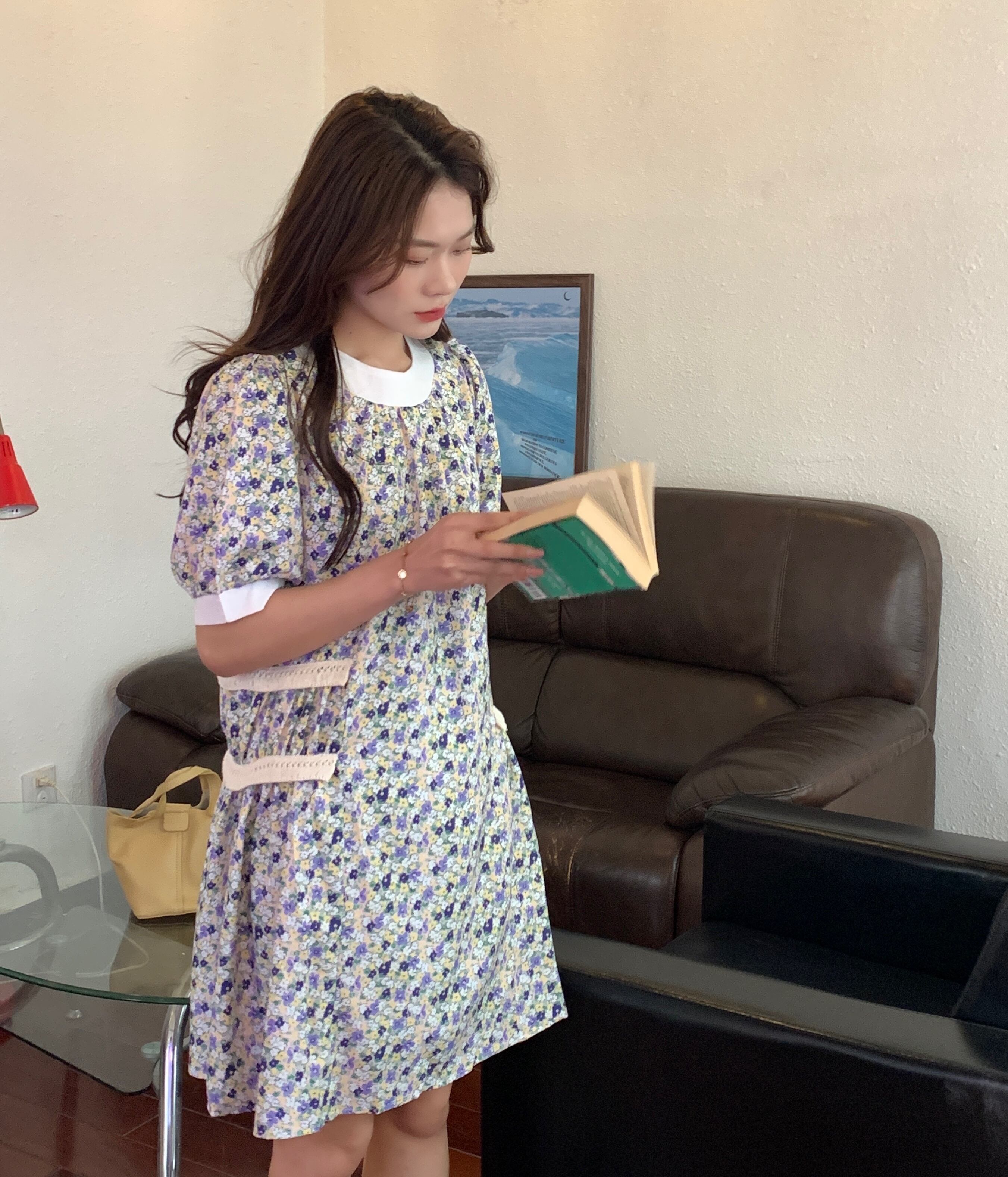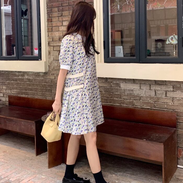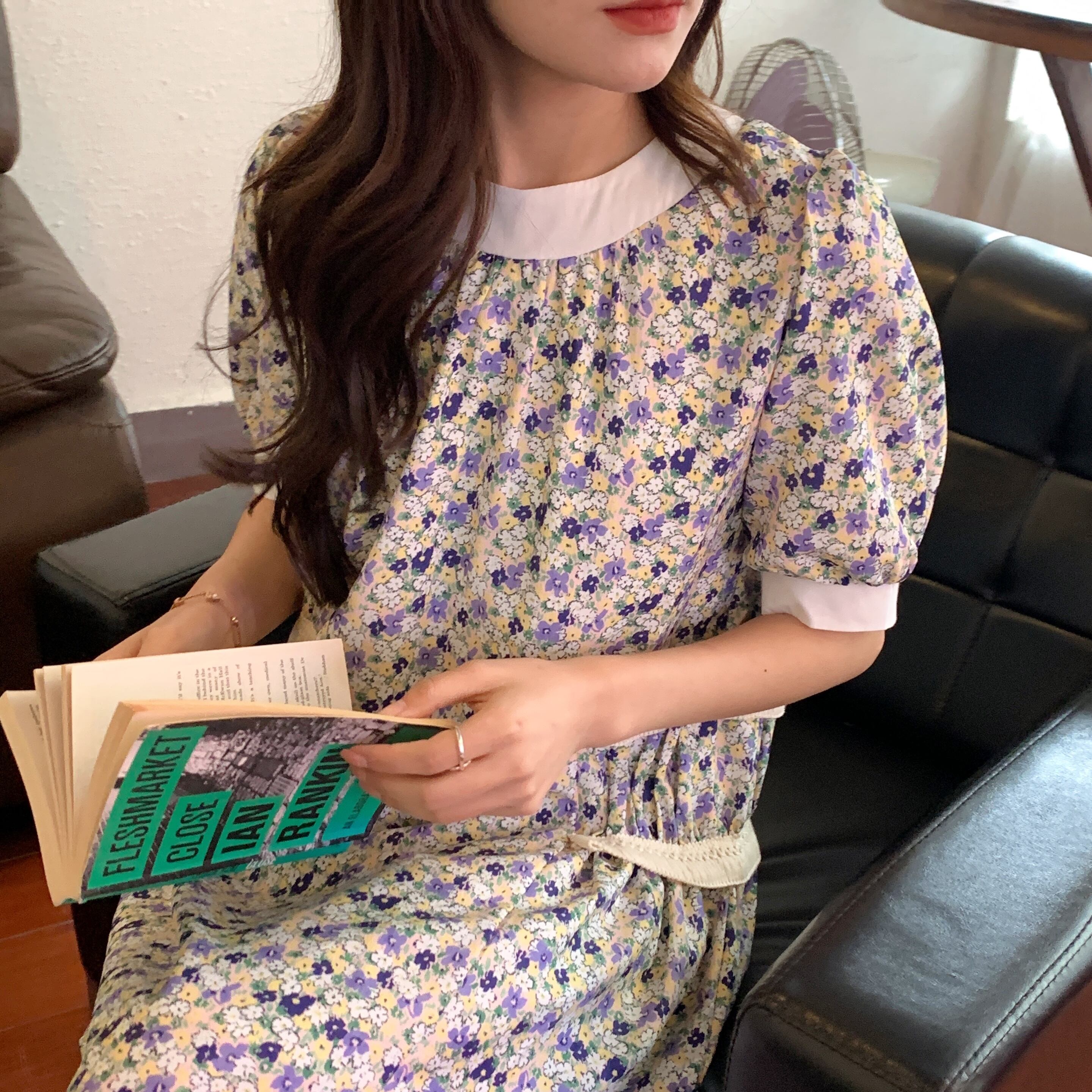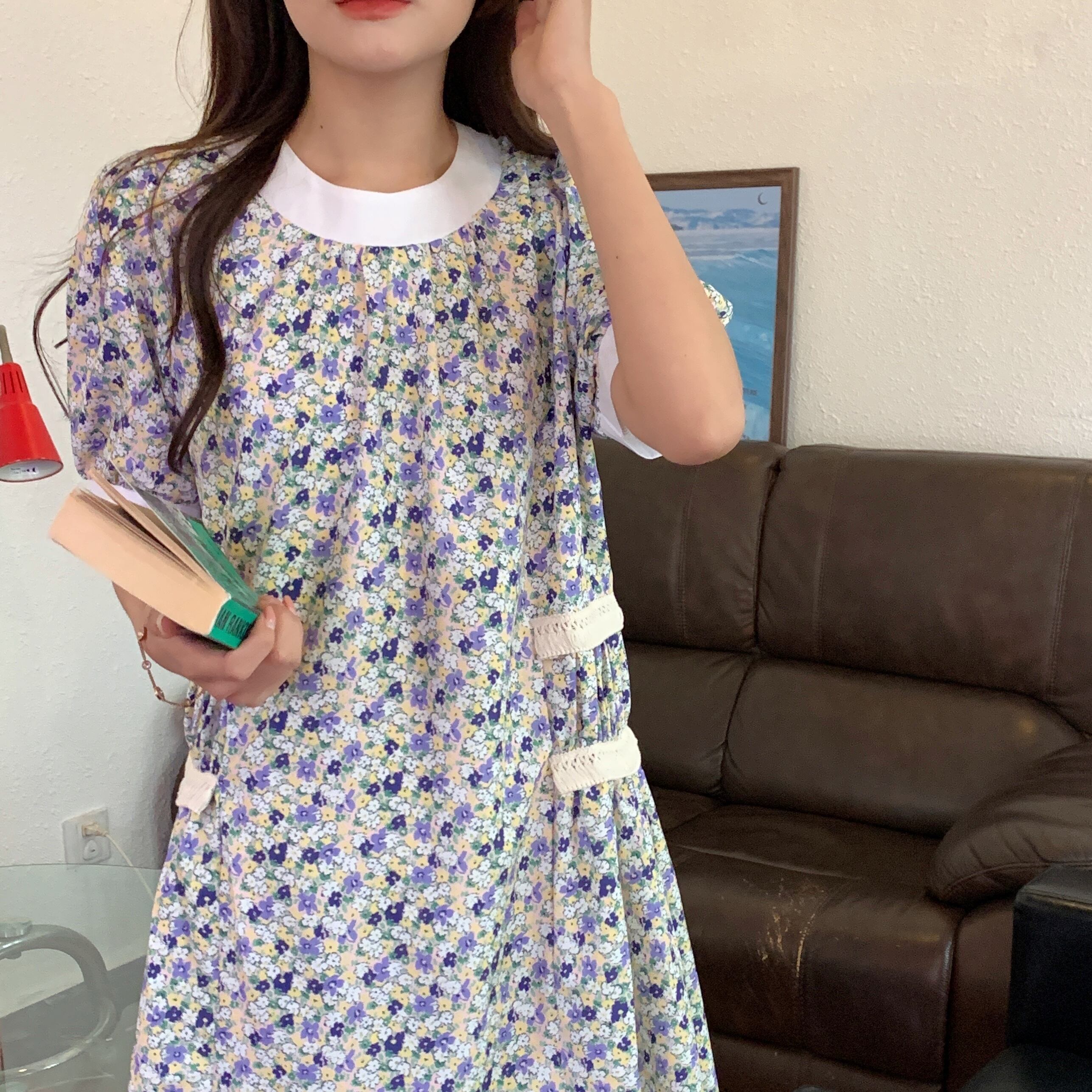 スタイルフローラルドレス サマースタンダードラウンドネックカラールーズ薄手ショートスカート レトロ 夏物 花柄 Oネック 5/17 mi465818348592