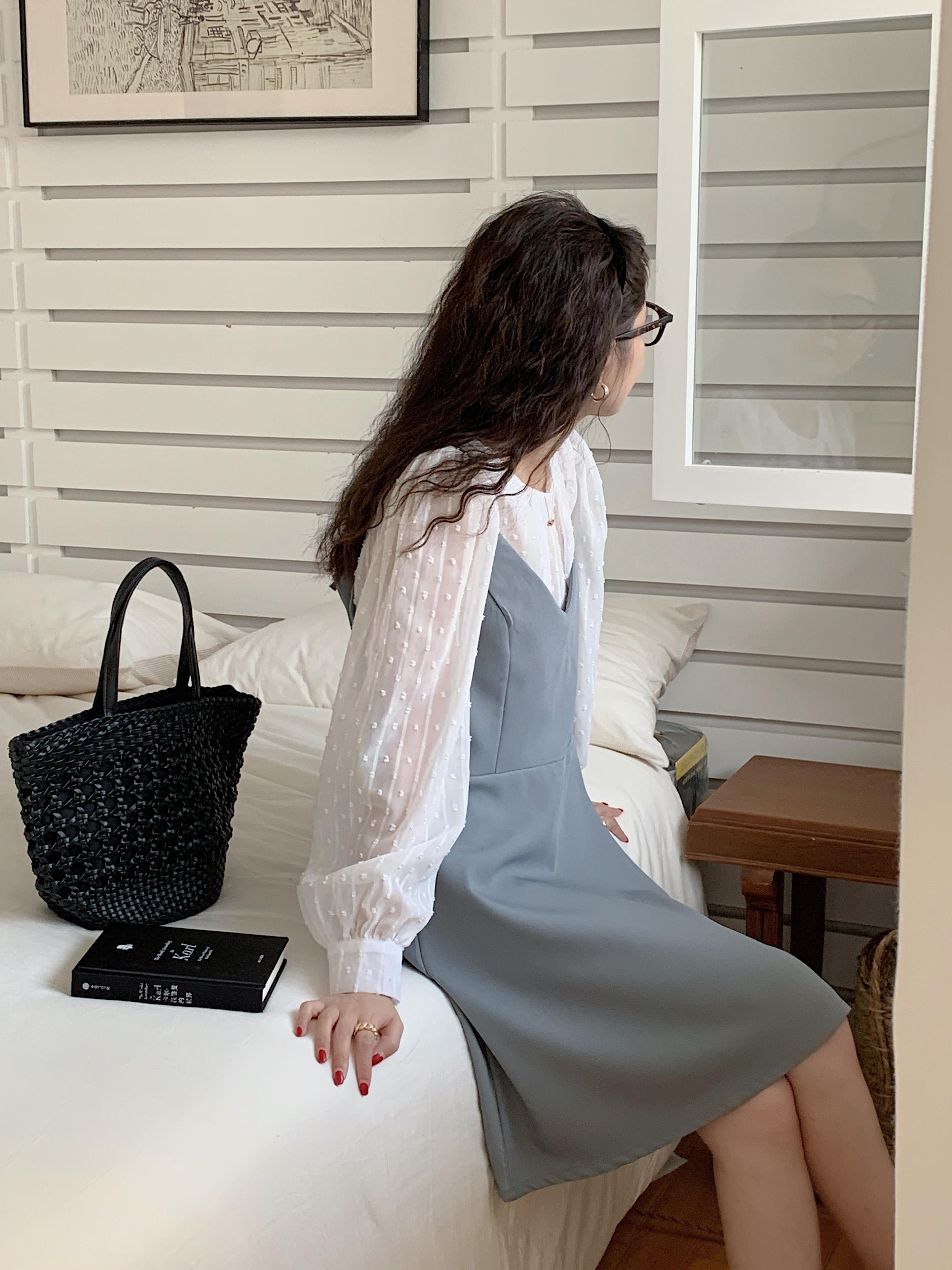 色:白のシャツ,青いシャツ,ブラックサスペンダースカート,フォグブルーのサスペンダースカート