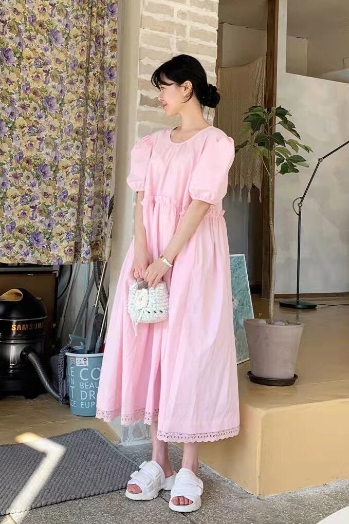 ラウンドネックルーズカジュアルドレス ロングスカート レディース ピンク Oネック 5/17 mi4684586625123