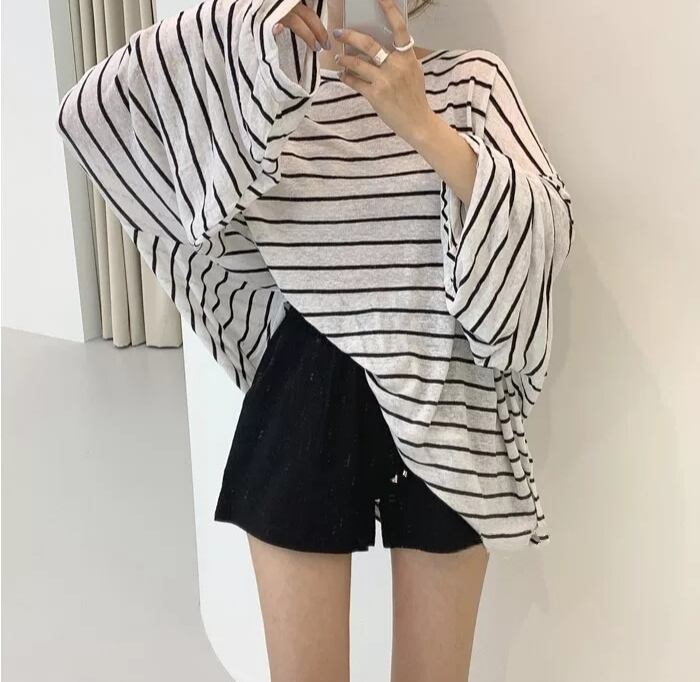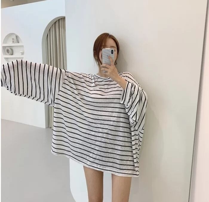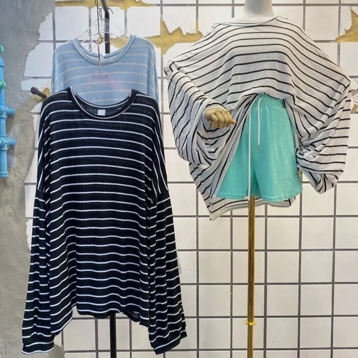 ルーズ薄手ストライプシャツ サマーラウンドネックTシャツ プルオーバー ロング 夏物 Oネック 5/17 mi4674812596824