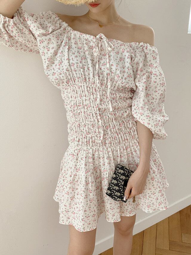 スタンダードフローラルウェストドレス ハイウェストAラインスカート レトロ レース 花柄 レースアップ 5/17 mi4691972264479