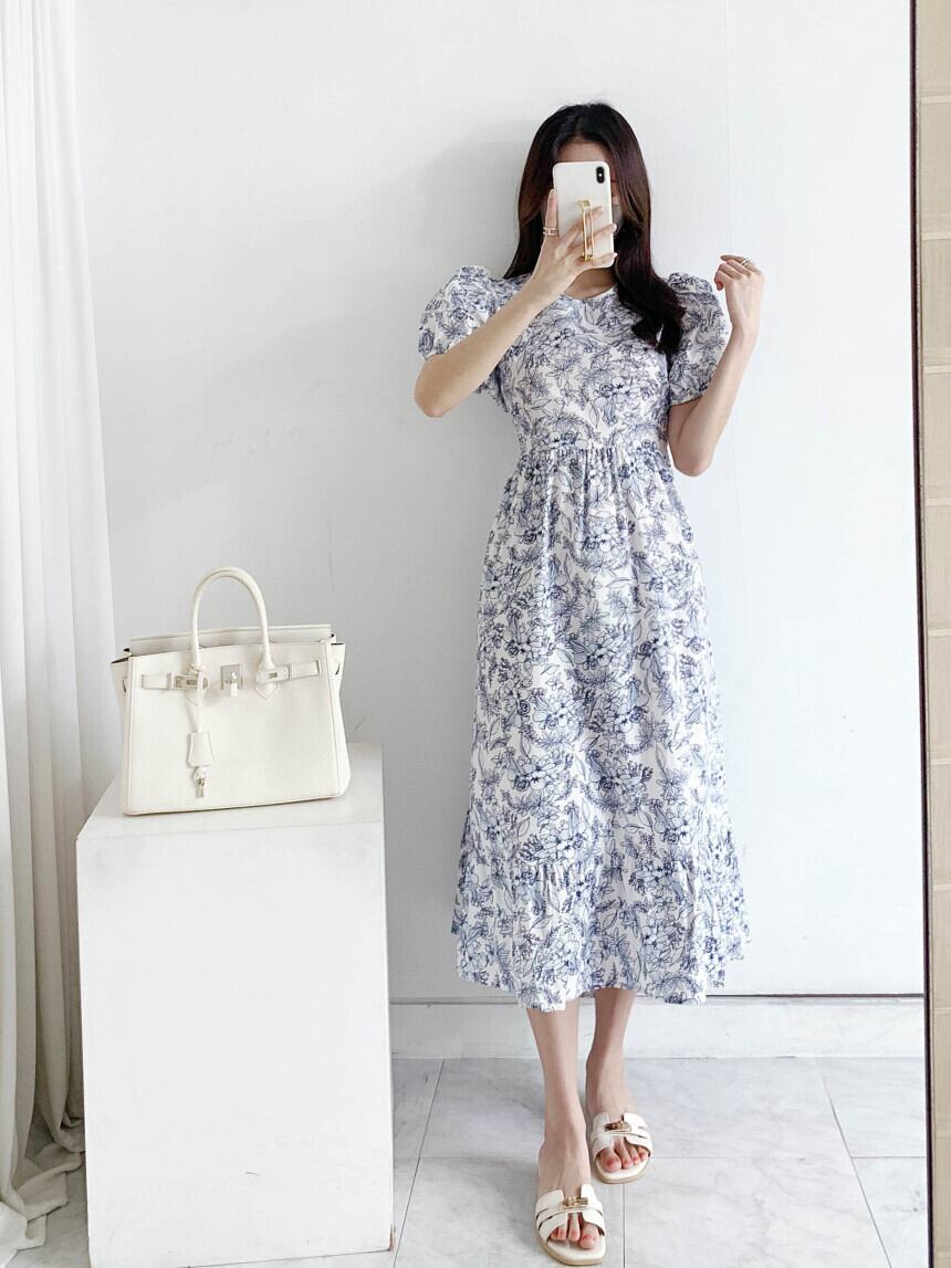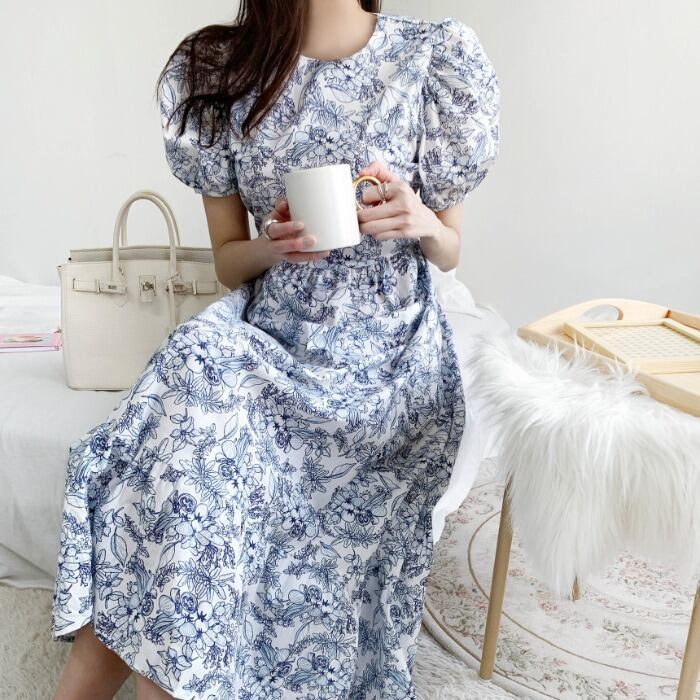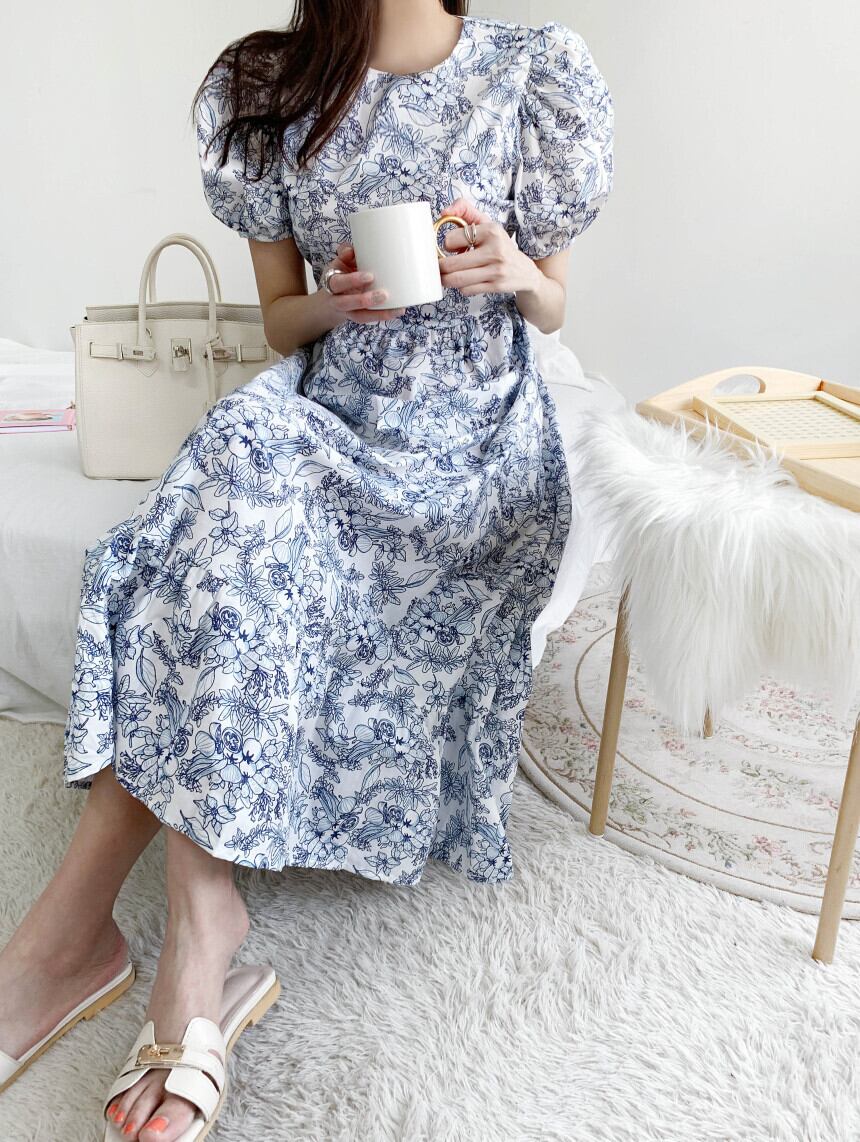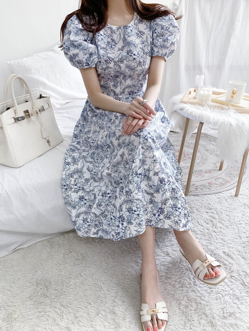 サマースタンダードラウンドネックプリント柄プリーツウェストスリーブラッフルドレス レトロ エレガント 夏物 Oネック 5/17 mi4695510340440