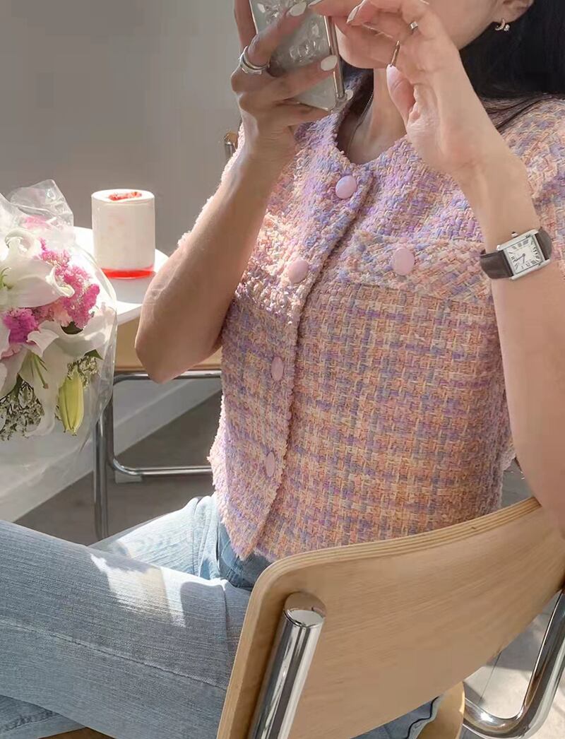 サマースタンダードラウンドネックボタンルーズポケットツィードショートコート レトロ 夏物 Oネック 5/17 mi4684122202004