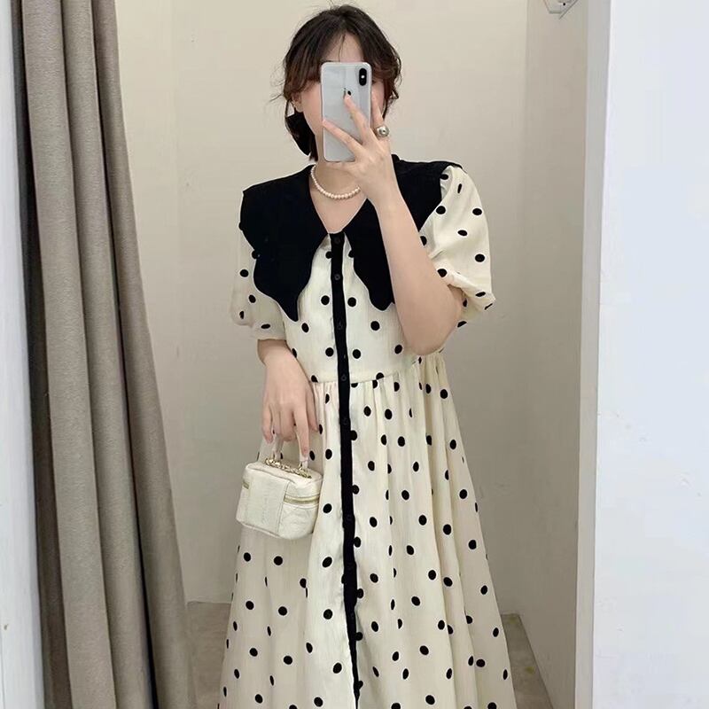 サマーカラー水玉ウェストスリムスリーブドレス ロングスカート エレガント 夏物 6/8 mi4652884696054