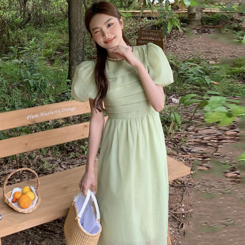 サマーラウンドネックプリーツウェストスリムスリーブドレス 夏物 Oネック 6/8 mi4654530269077