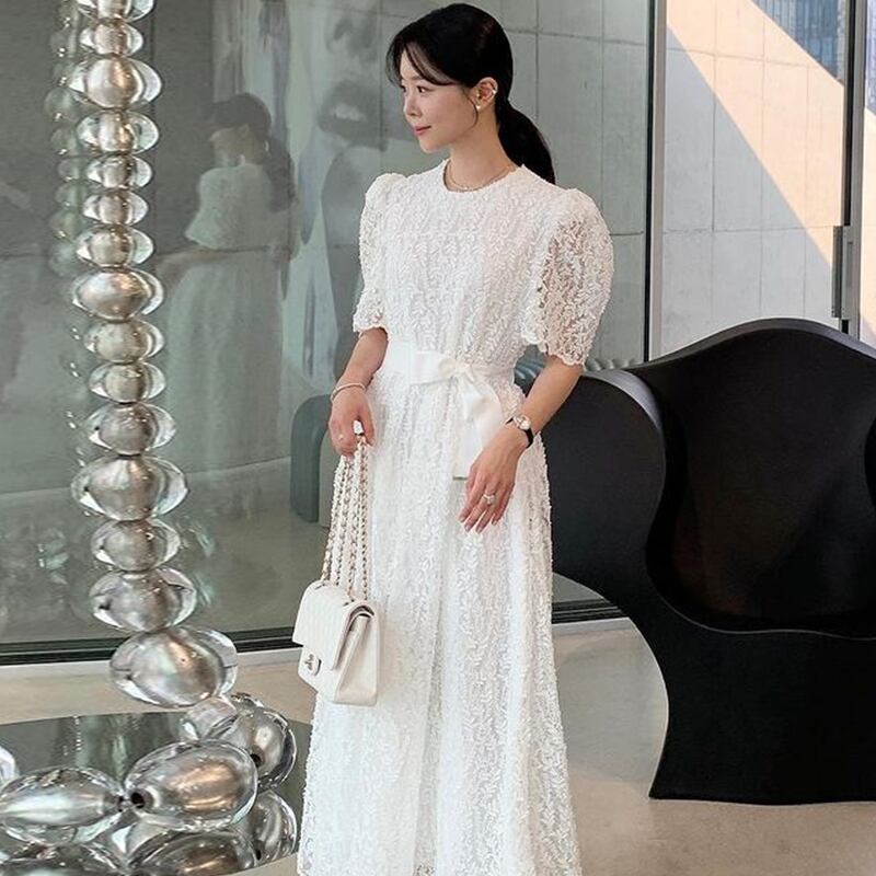 サマーラウンドネックレースFlowerデザイン ウェストスリーブドレス 大人ガーリー スウィート キュート カジュアル エレガント 夏物 Oネック フラワーデザイン 6/8 mi4622562822079