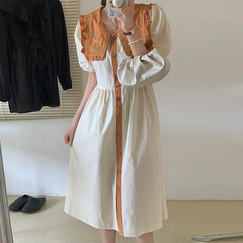 サマーカラーウェスト薄手スリーブドレス レッド 刺繍 夏物 フラワーデザイン 6/8 mi4676132841207