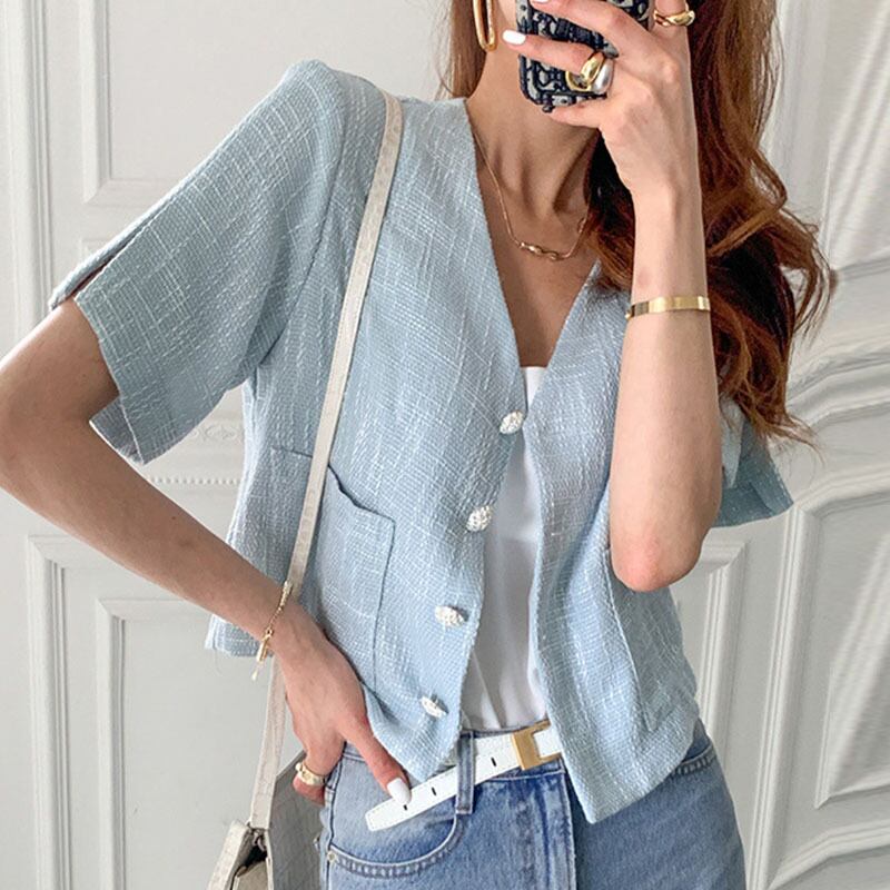 サマースタンダードVネックカラールーズツィードカーディガンジャケット レトロ 夏物 6/8 mi4683104813029