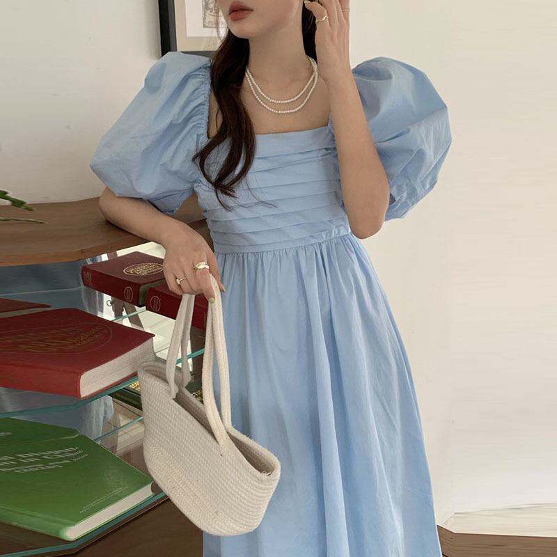 サマーカラーウェストスリムスリーブドレス ロングスカート ランタンスリーブ 夏物 スクウェア 6/8 mi4629901322737