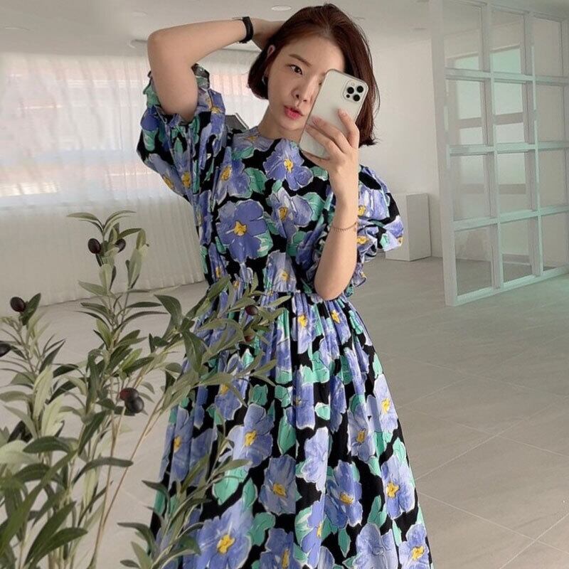 サマースタンダードラウンドネックプリーツウェスト薄手Flowerデザイン プリント柄ドレス レトロ エレガント 夏物 Oネック フラワーデザイン 6/8 mi464953794116