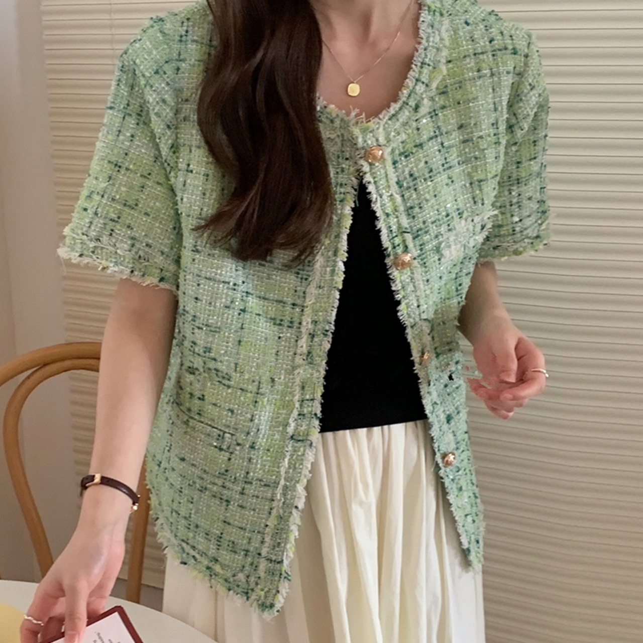 サマーラウンドネックメタルルーズツィードジャケット レディース エレガント 夏物 Oネック 6/8 mi4686676151628